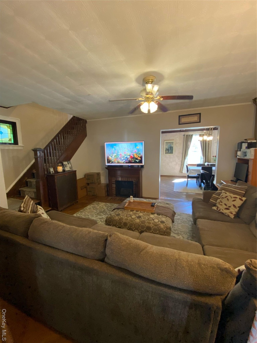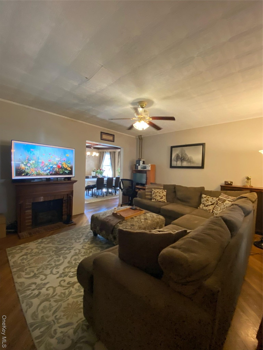 - Living area featuring wood finished floors, a brick fireplace, and a ceiling fan