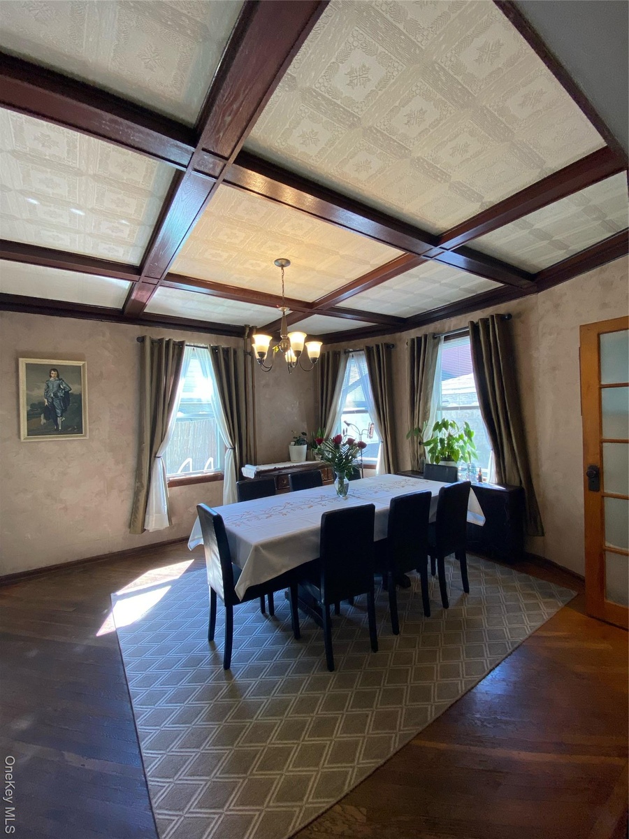 - Dining space featuring healthy amount of natural light, wood-type flooring, a chandelier, coffered ceiling, and beamed ceiling