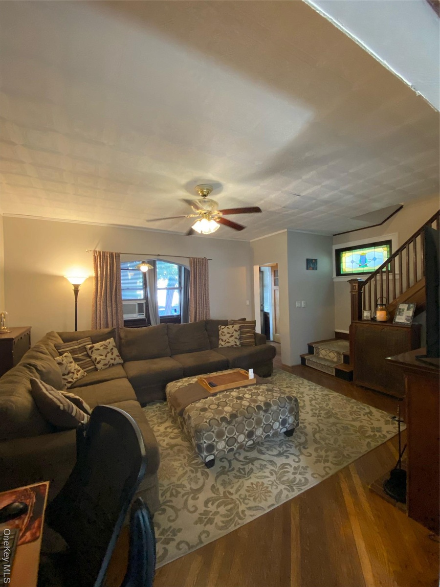- Living room with wood finished floors, stairs, and a ceiling fan