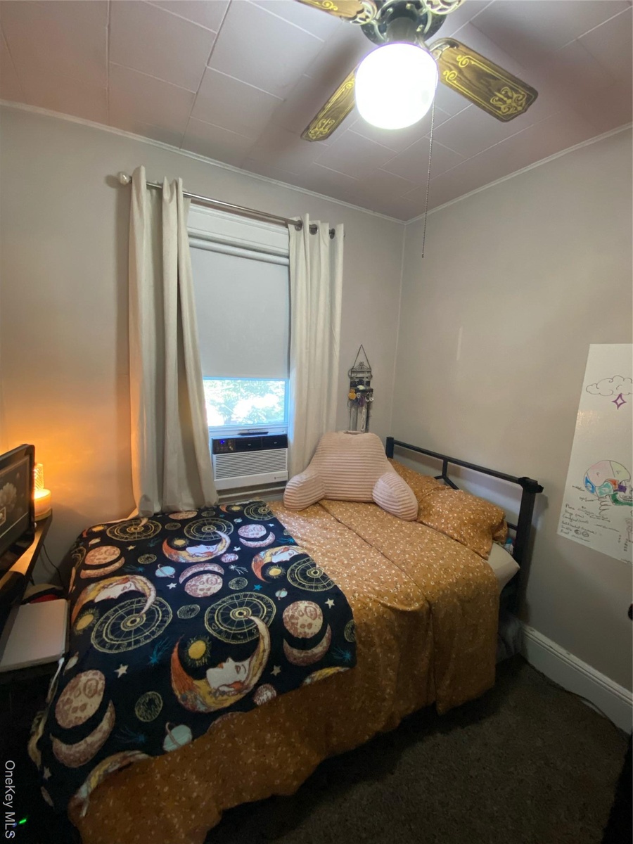 - Bedroom featuring crown molding, ceiling fan, and carpet flooring