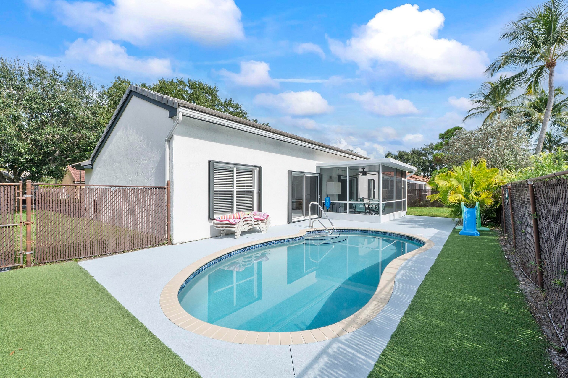 DescriptionImpeccably Maintained Home in Sunrise Estates - Winston ParkThis move-in ready home has been meticulously cared for, featuring a split floor plan and soaring cathedral ceilings. The interior boasts quartz countertops in the kitchen, a marble bath vanity with an oversized tub in the master bathroom, ceramic tile throughout with wood flooring in the bedrooms, all enhanced by fresh paint.Step outside to a fully fenced yard and enjoy a 5-foot deep heated fresh-water pool redone in 2017, with LED changeable lighting and a new pump installed in 2025 surrounded by pristine astro turf in a totally fenced in backyard. The 10 x 15 screened-in back patio is perfect for relaxing or entertaining.