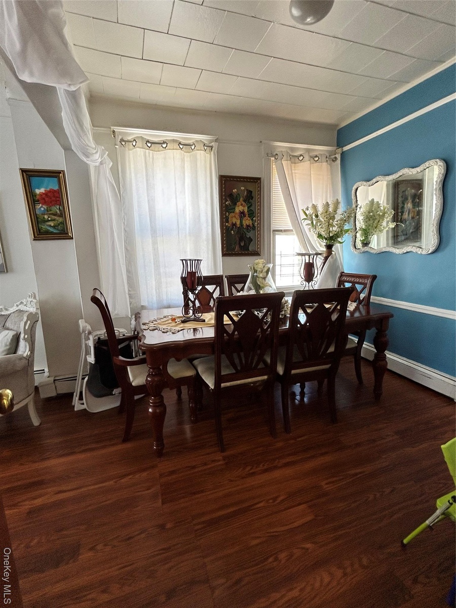 - Dining room featuring dark wood-style flooring and a baseboard radiator