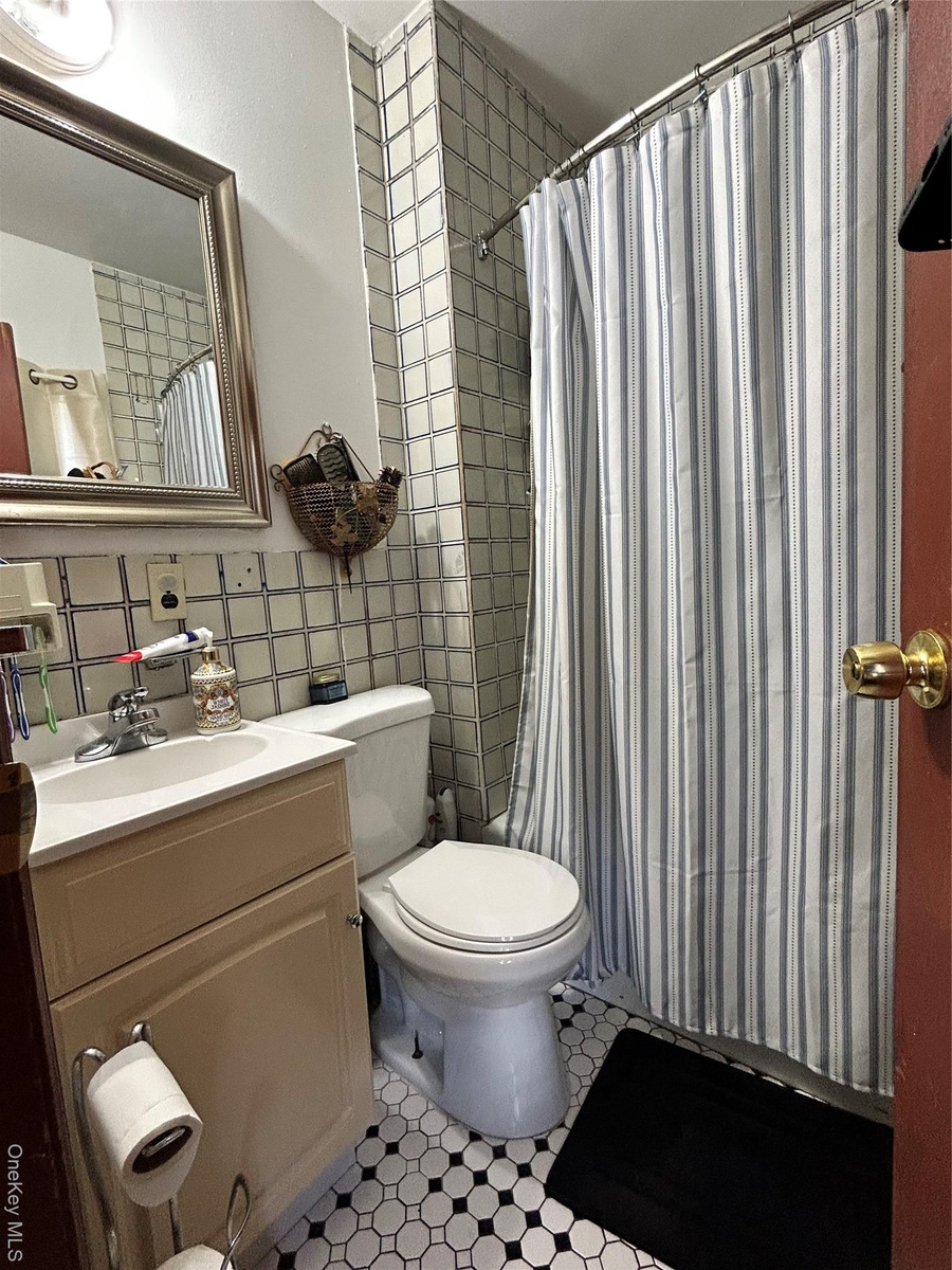 - Bathroom featuring vanity, a shower with curtain, and tile walls