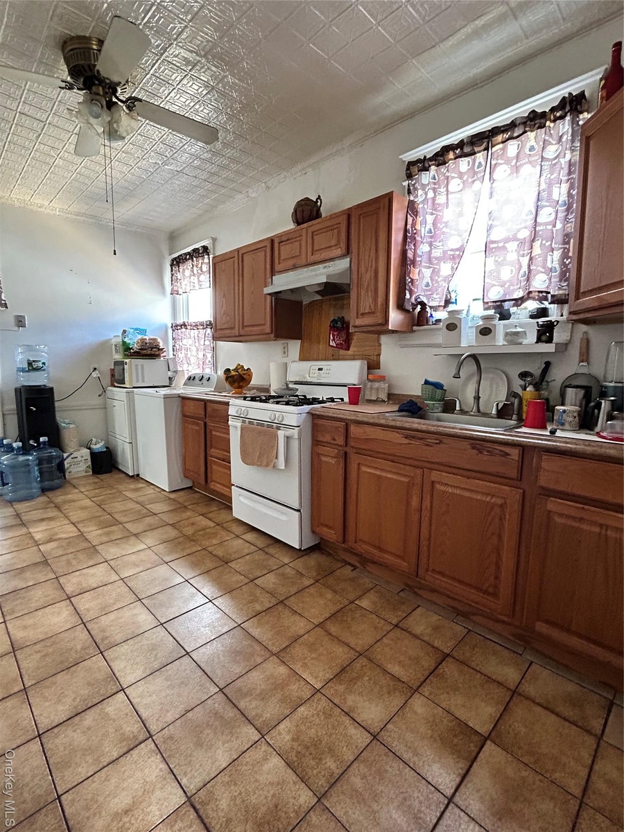 - Kitchen with white gas range oven, brown cabinets, ceiling fan, washer / dryer, and an ornate ceiling