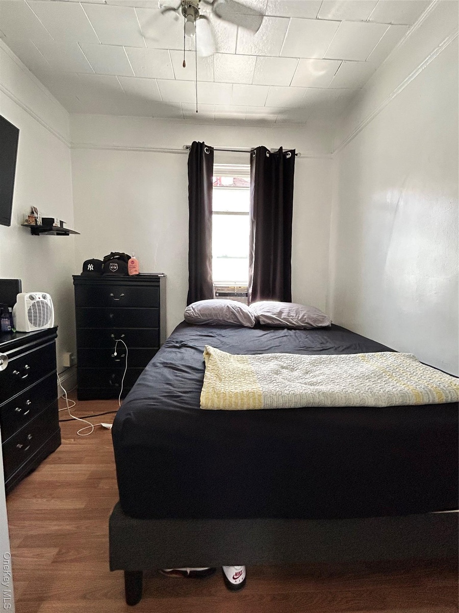 - Living room with a drop ceiling, dark wood finished floors, and a baseboard radiator