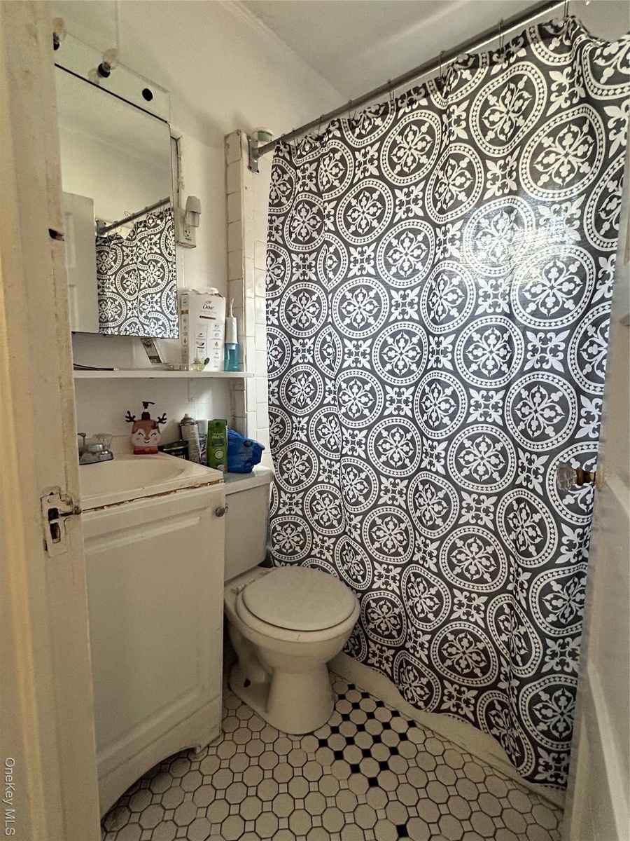 - Bathroom with vanity, a shower with shower curtain, and light tile patterned floors