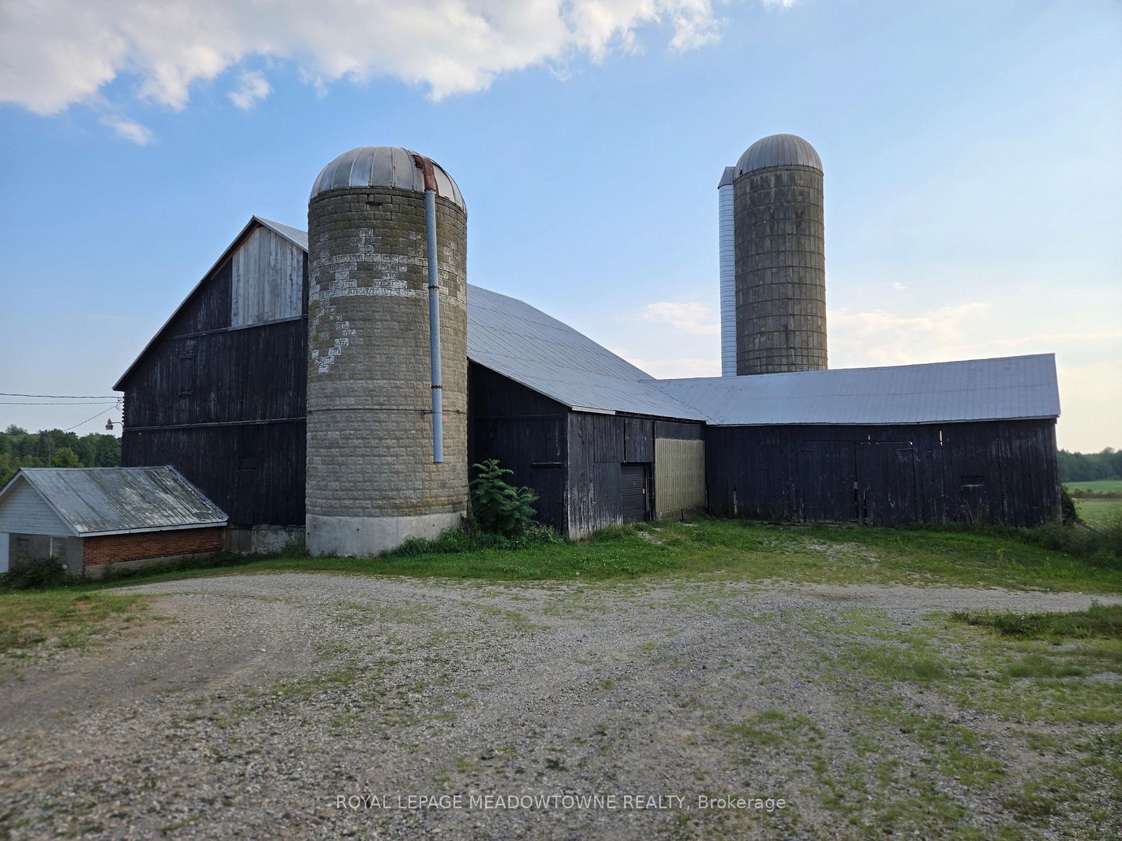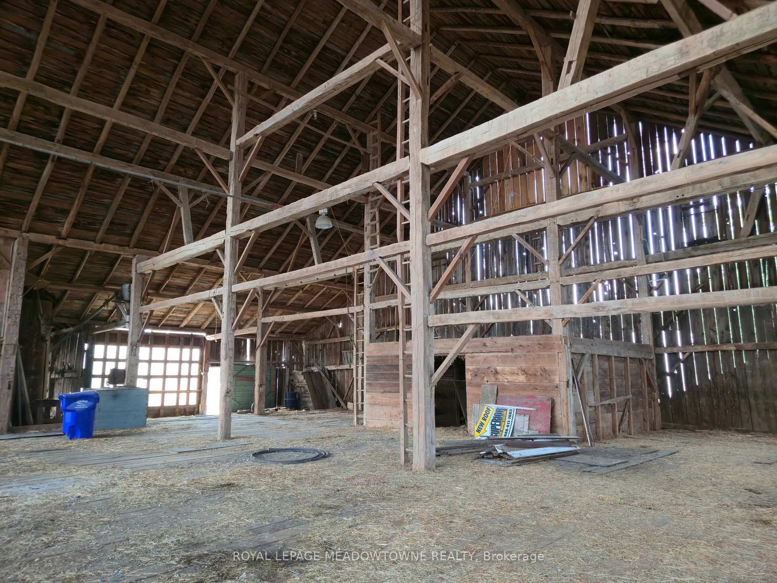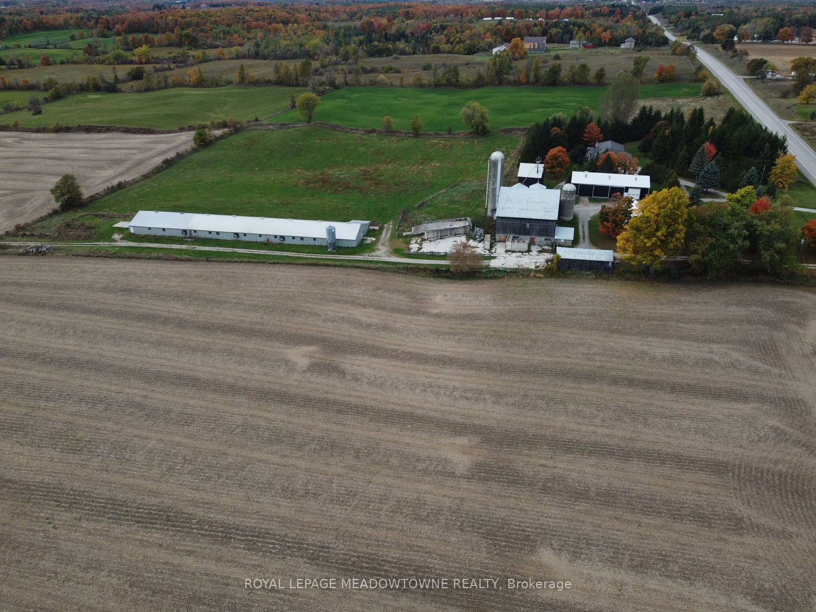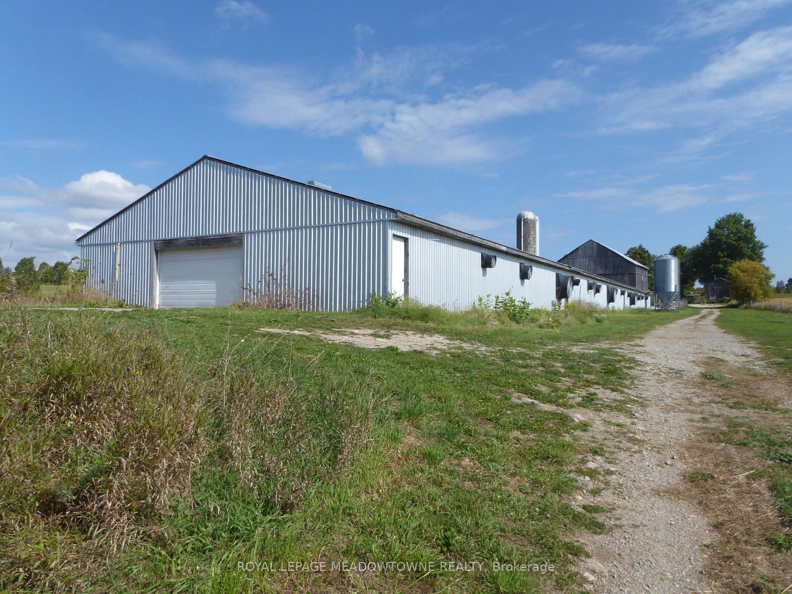 Once in a lifetime opportunity. Spanning over 98.89 acres of gently rolling countryside, this remarkable property offers exceptional versatility for farming, agribusiness, equestrian pursuits, special events, or rental investment opportunities. Whether you envision cash cropping, turkey and chicken production, egg farming, or developing a horse ranch with paddocks, the possibilities here are endless. Set back from the paved road nestled in the trees is a carpet free 2,300 SF stone and brick bungalow with a full walk-out basement. Designed with flexibility in mind for a potential in-law suite with its own entrance, kitchenette, laundry, and walk-out patio. The main floor features a bright eat-in kitchen with large central island, walk-out to a deck, formal dining room with pocket French doors & open-concept great room. The principal bedroom includes a 3-piece ensuite and walk-in closet. All bedrooms offer hardwood flooring and large closets. A large main floor A 2024 propane furnace and central air, a metal roof (2014), Agricultural & Business Infrastructure includes a separate drilled well. Broiler Barn: 48 x 288 (13,824 sq ft) equipped with feed system, propane heaters, nipple waterers, and Big Dutchman feeders (all sold as-is). Bank Barn: 3,900+ sq ft in excellent condition, with capacity for 18,000 square bales, attached milk house, and additional storage shed- ideal for agricultural use or hosting events. Drive Shed: 40 x 80 with heated, insulated workshop, 16ft ceilings, concrete floors, and crane. Additional structures include silos, coverall storage, feed tanks, utility shed, single garage, and multiple outbuildings. Land Use: 65+/- acres currently cash cropped (soybeans & winter wheat), with 25 acres in hay. 12 acres forested with mature maple trees potential for syrup production. Severance potential in southeast corner and some conservation. HST in addition to purchase price. Only minutes to Acton GO Station, shopping, golf course & services.