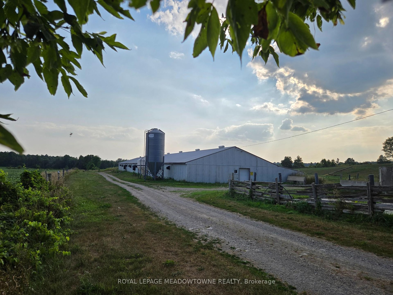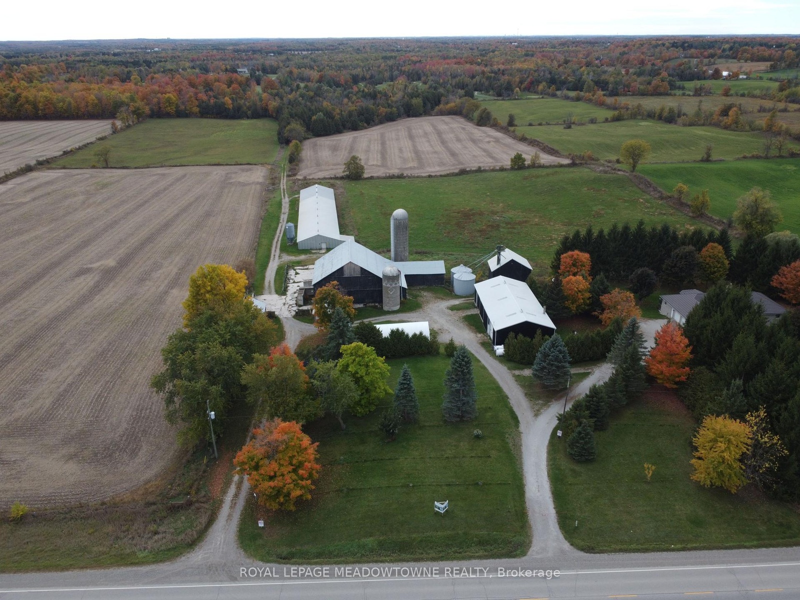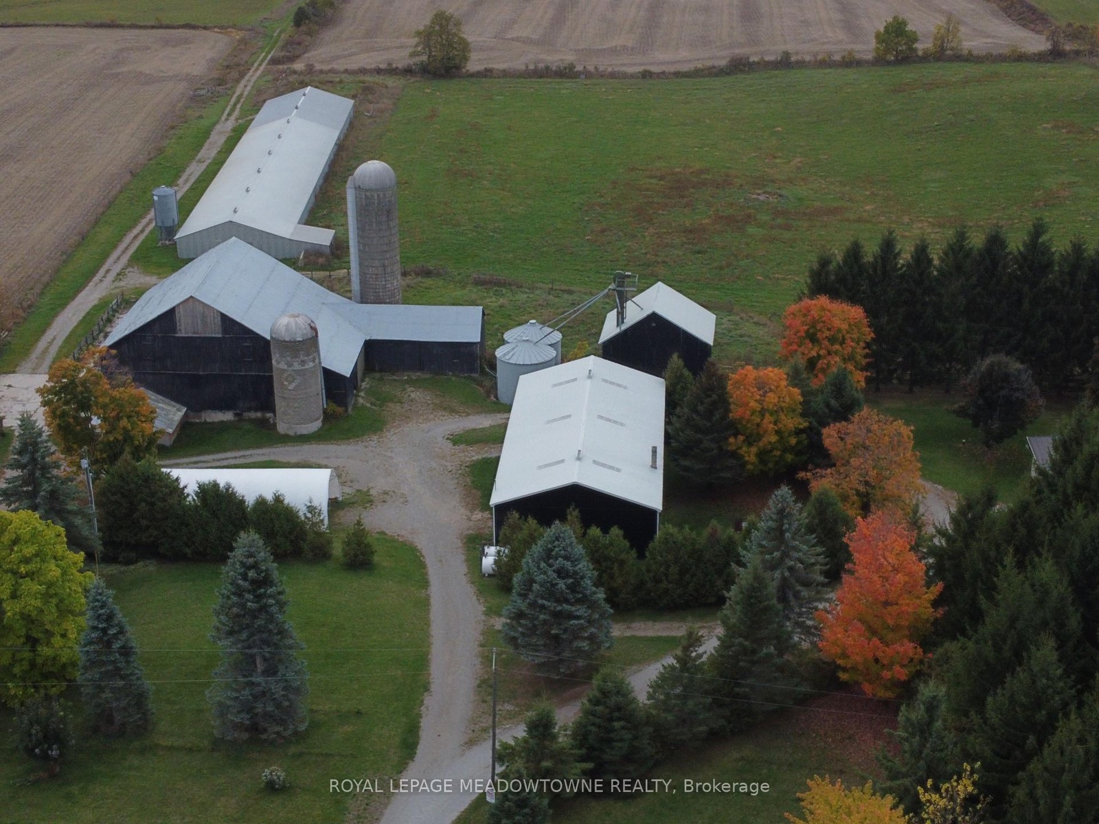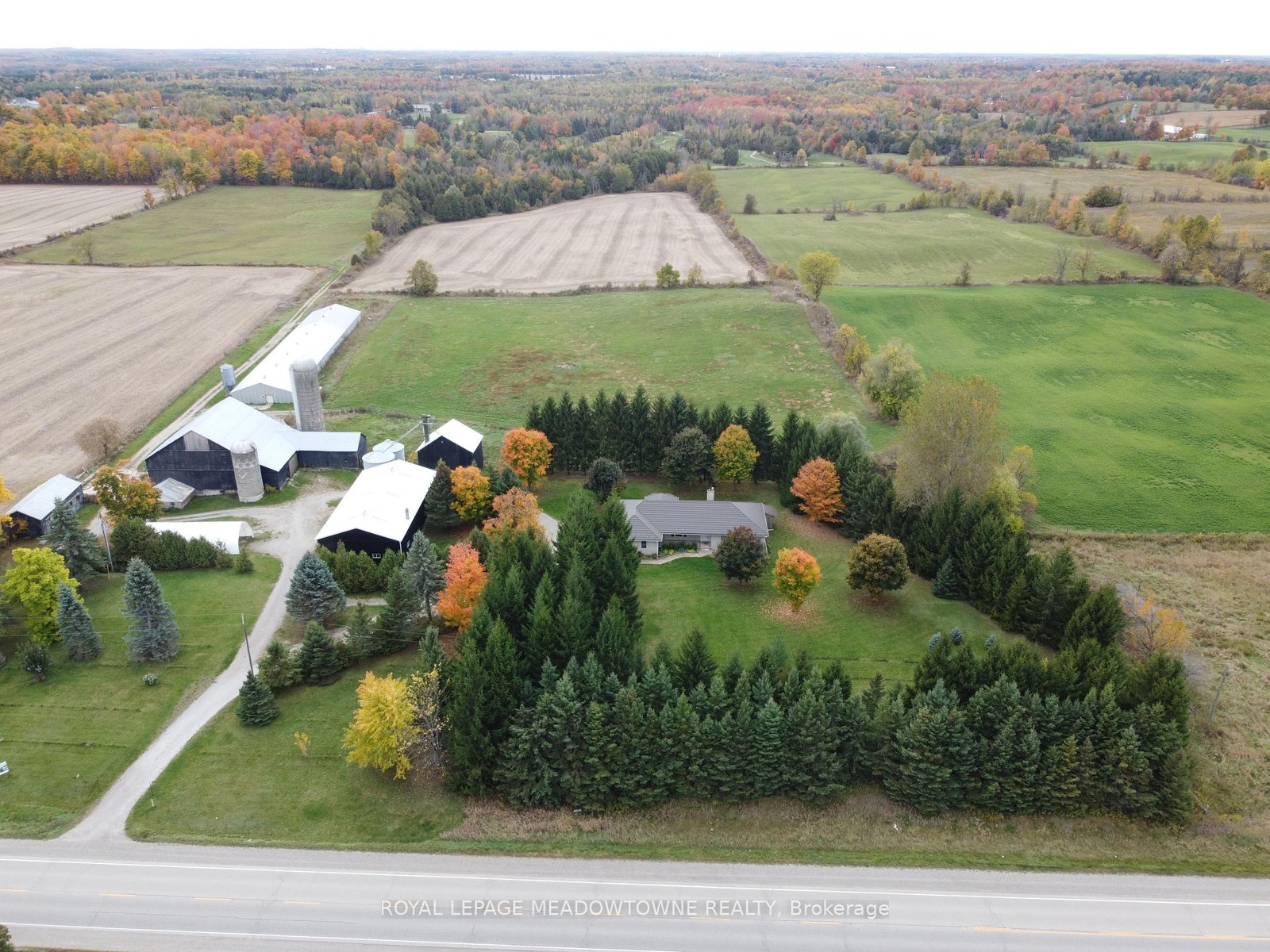 Once in a lifetime opportunity. Spanning over 98.89 acres of gently rolling countryside, this remarkable property offers exceptional versatility for farming, agribusiness, equestrian pursuits, special events, or rental investment opportunities. Whether you envision cash cropping, turkey and chicken production, egg farming, or developing a horse ranch with paddocks, the possibilities here are endless. Set back from the paved road nestled in the trees is a carpet free 2,300 SF stone and brick bungalow with a full walk-out basement. Designed with flexibility in mind for a potential in-law suite with its own entrance, kitchenette, laundry, and walk-out patio. The main floor features a bright eat-in kitchen with large central island, walk-out to a deck, formal dining room with pocket French doors & open-concept great room. The principal bedroom includes a 3-piece ensuite and walk-in closet. All bedrooms offer hardwood flooring and large closets. A large main floor A 2024 propane furnace and central air, a metal roof (2014), Agricultural & Business Infrastructure includes a separate drilled well. Broiler Barn: 48 x 288 (13,824 sq ft) equipped with feed system, propane heaters, nipple waterers, and Big Dutchman feeders (all sold as-is). Bank Barn: 3,900+ sq ft in excellent condition, with capacity for 18,000 square bales, attached milk house, and additional storage shed- ideal for agricultural use or hosting events. Drive Shed: 40 x 80 with heated, insulated workshop, 16ft ceilings, concrete floors, and crane. Additional structures include silos, coverall storage, feed tanks, utility shed, single garage, and multiple outbuildings. Land Use: 65+/- acres currently cash cropped (soybeans & winter wheat), with 25 acres in hay. 12 acres forested with mature maple trees potential for syrup production. Severance potential in southeast corner and some conservation. HST in addition to purchase price. Only minutes to Acton GO Station, shopping, golf course & services.