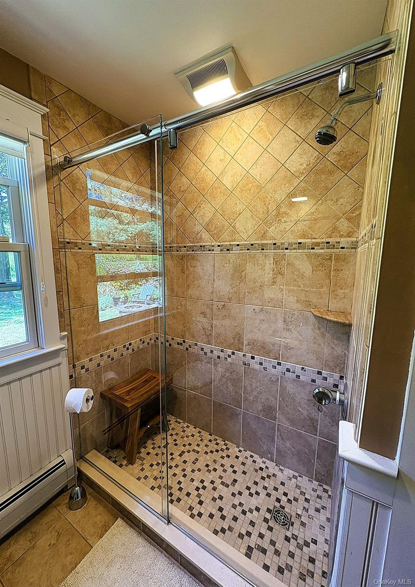- Bathroom featuring a stall shower, baseboard heating, and tile patterned floors