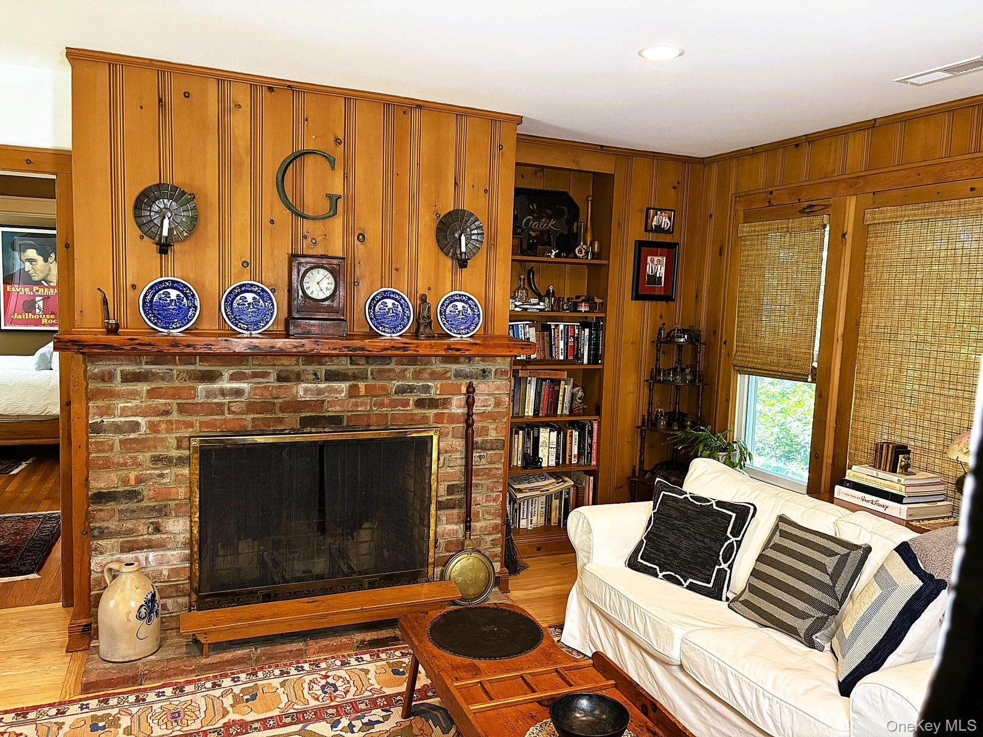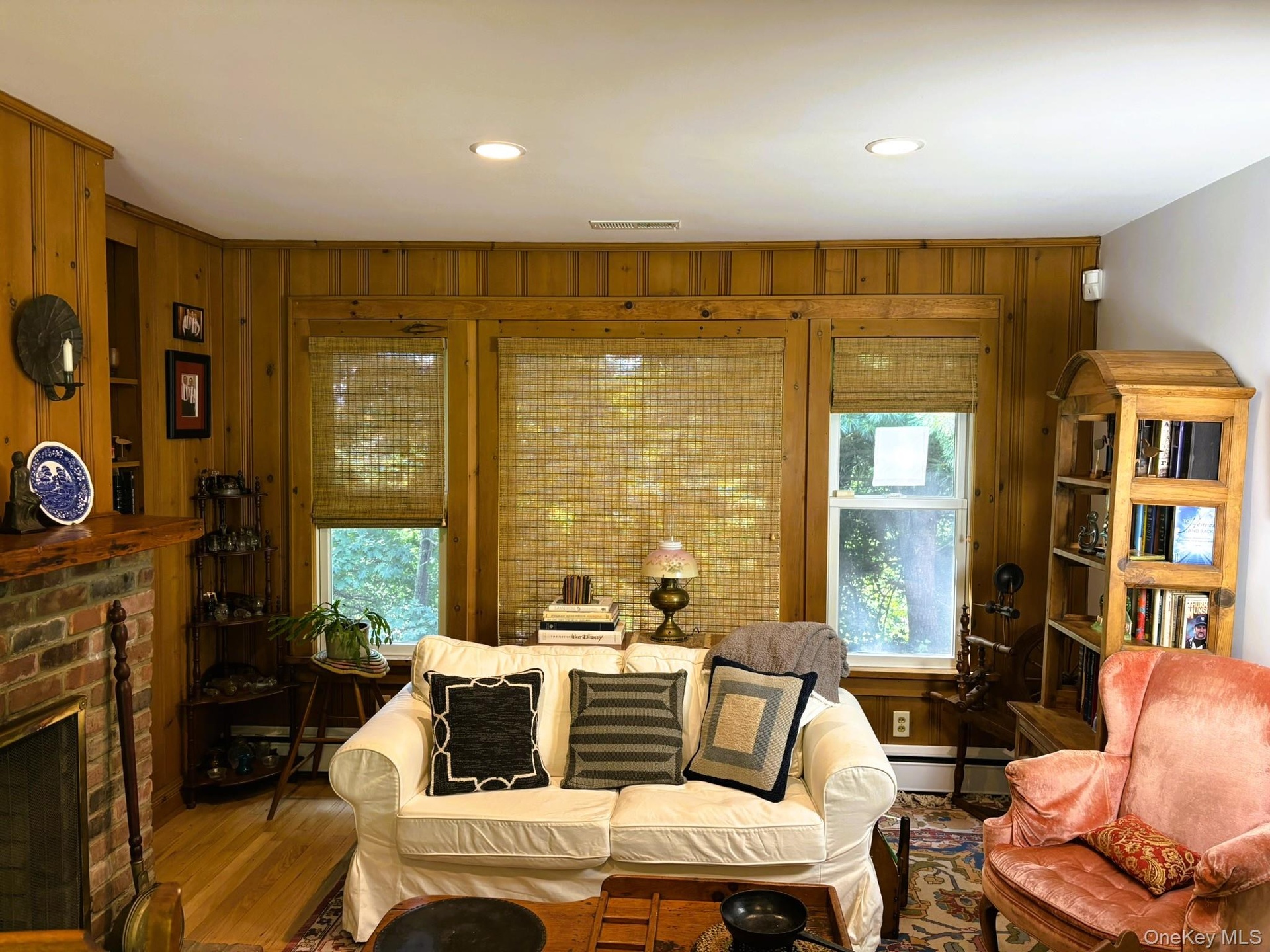 - Living room featuring wooden walls, a fireplace, wood finished floors, built in features, and recessed lighting
