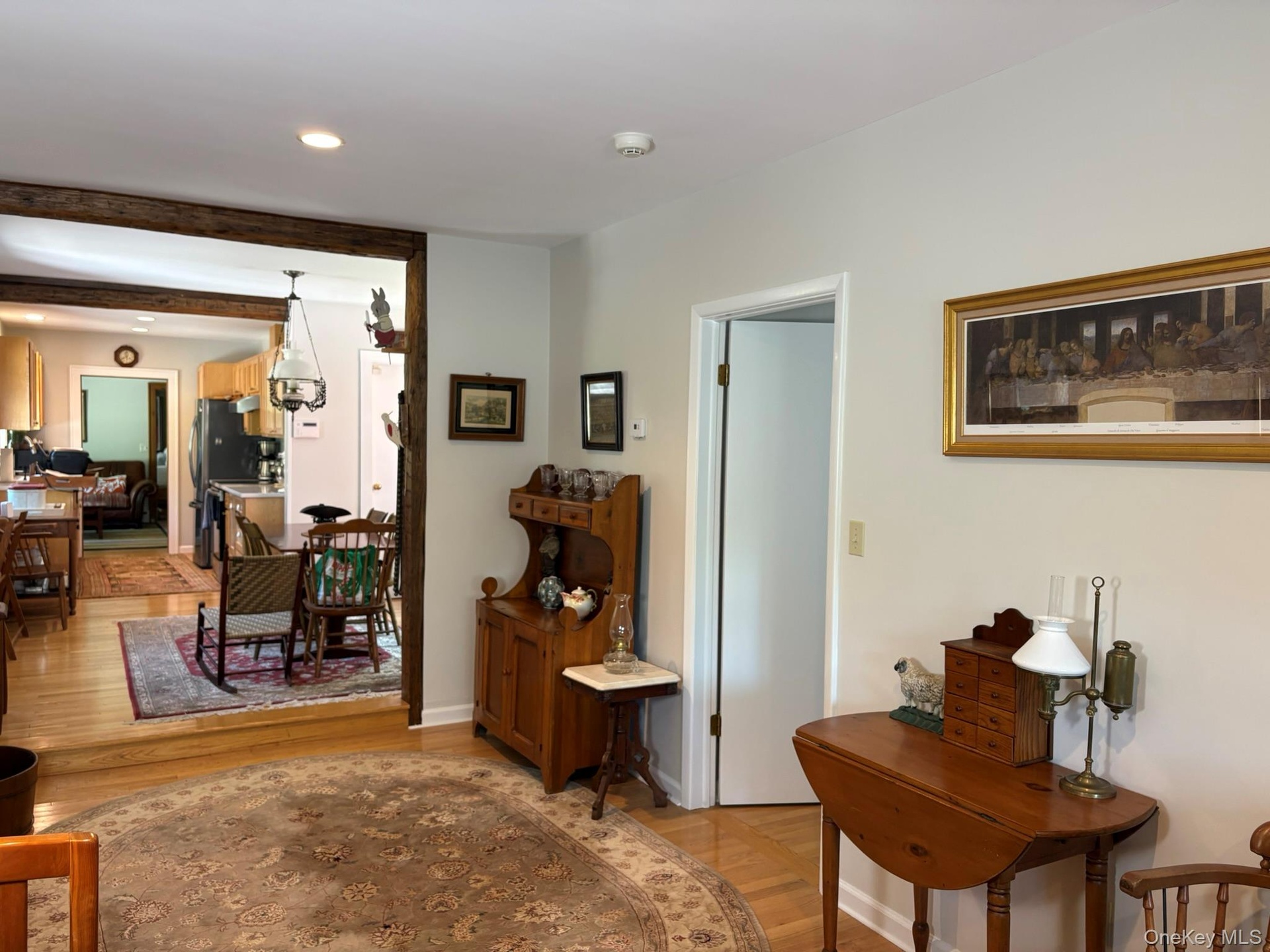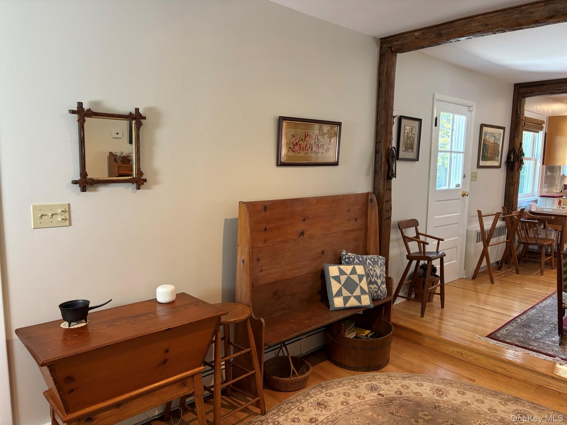 - Sitting room with light wood-style flooring, radiator heating unit, beam ceiling, and a baseboard radiator