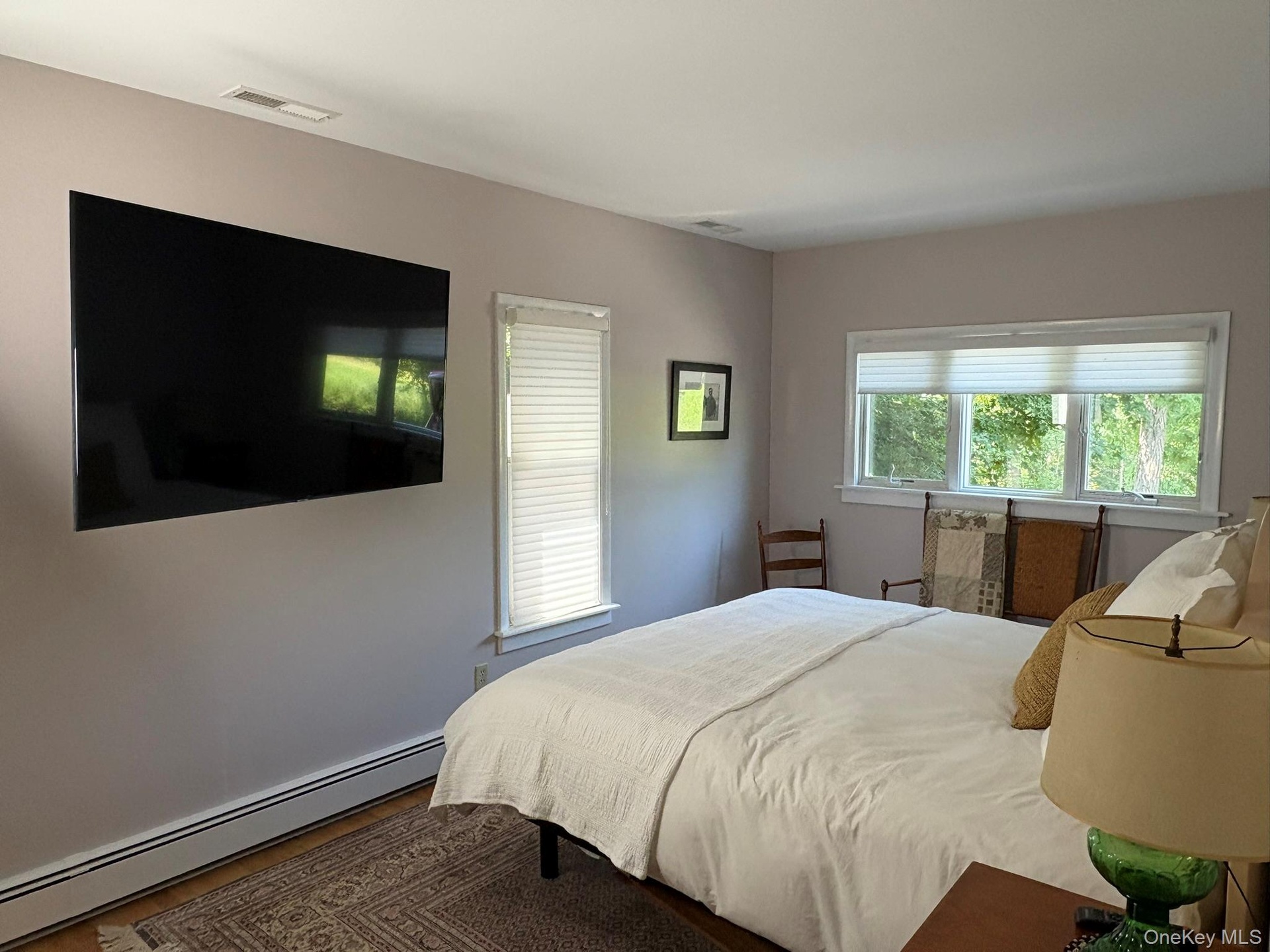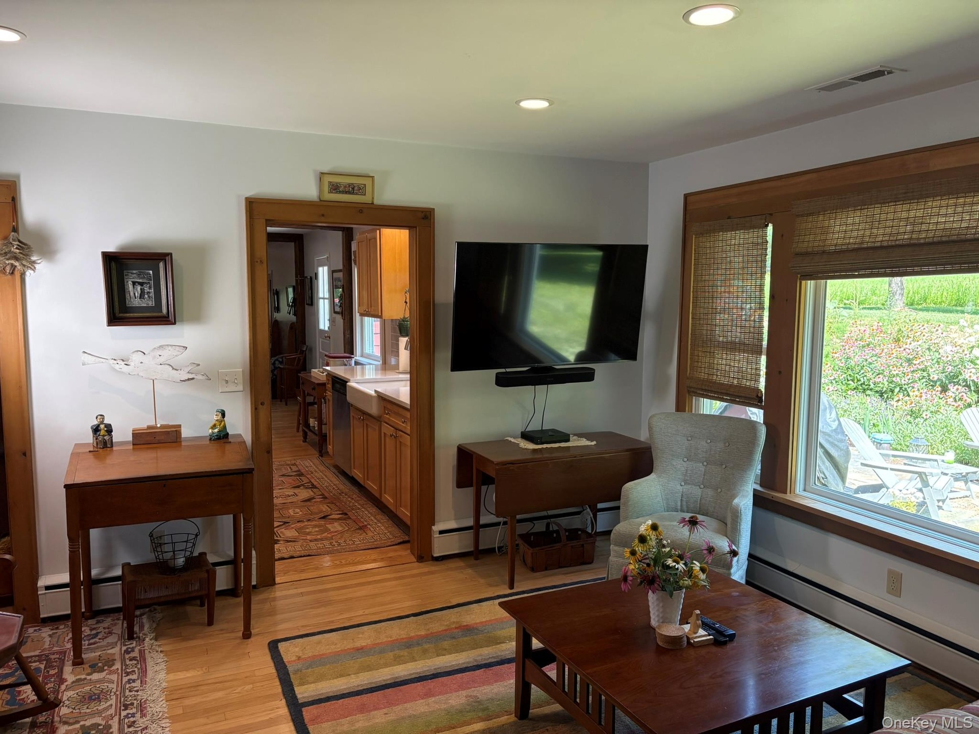 - Living room with a baseboard radiator, a baseboard heating unit, and wood finished floors