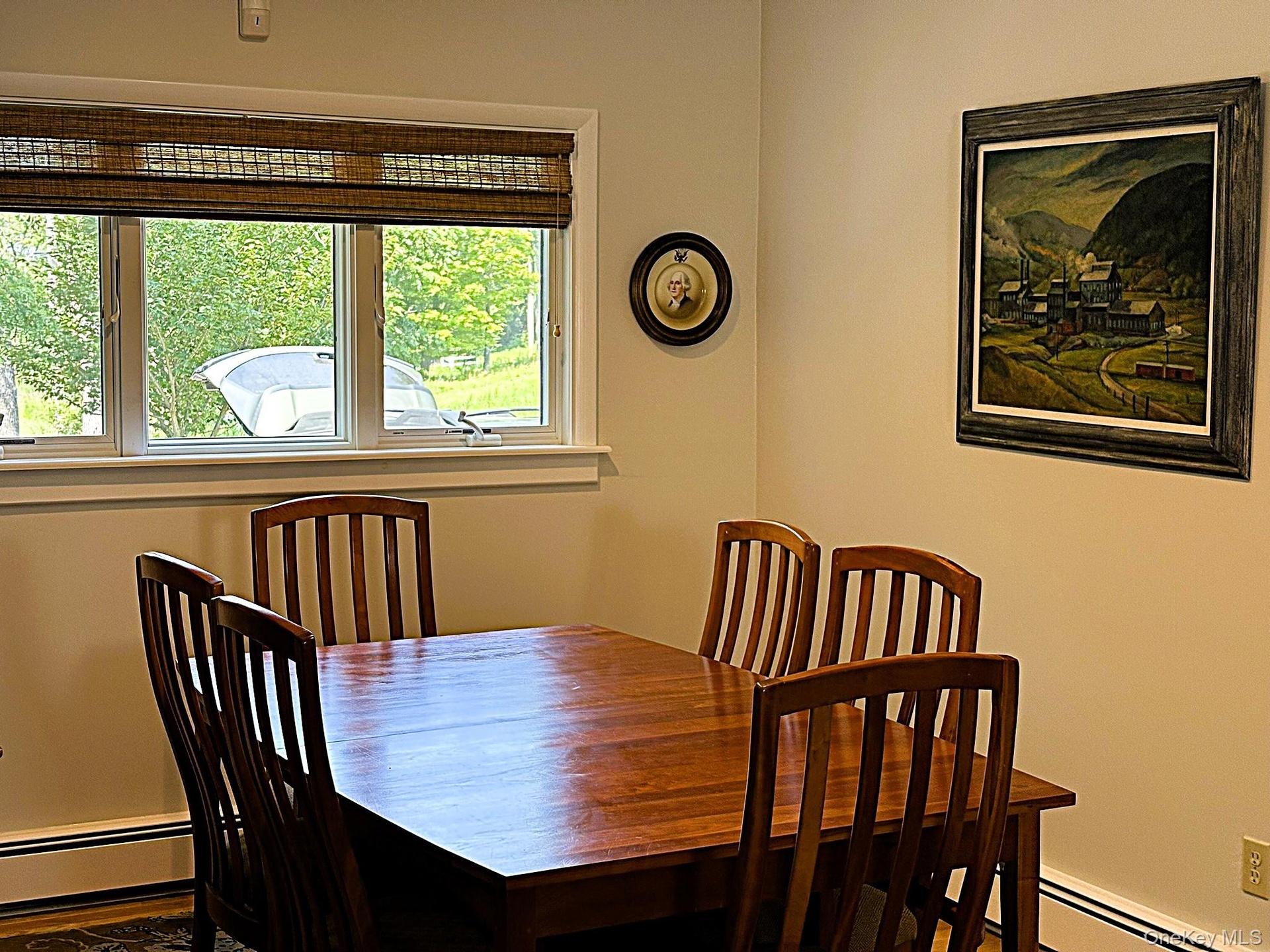 - Dining space featuring light wood-style flooring, recessed lighting, and a baseboard heating unit