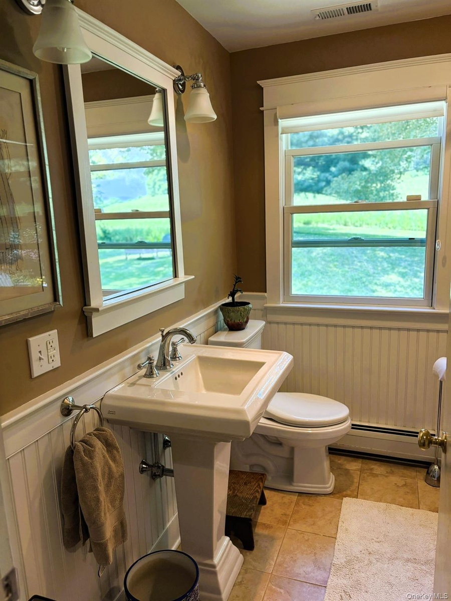 - Bathroom with a wainscoted wall, plenty of natural light, a baseboard radiator, and light tile patterned floors