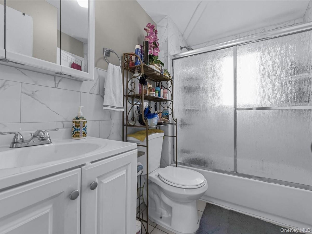 - Full bathroom with enclosed tub / shower combo, vanity, and tile walls