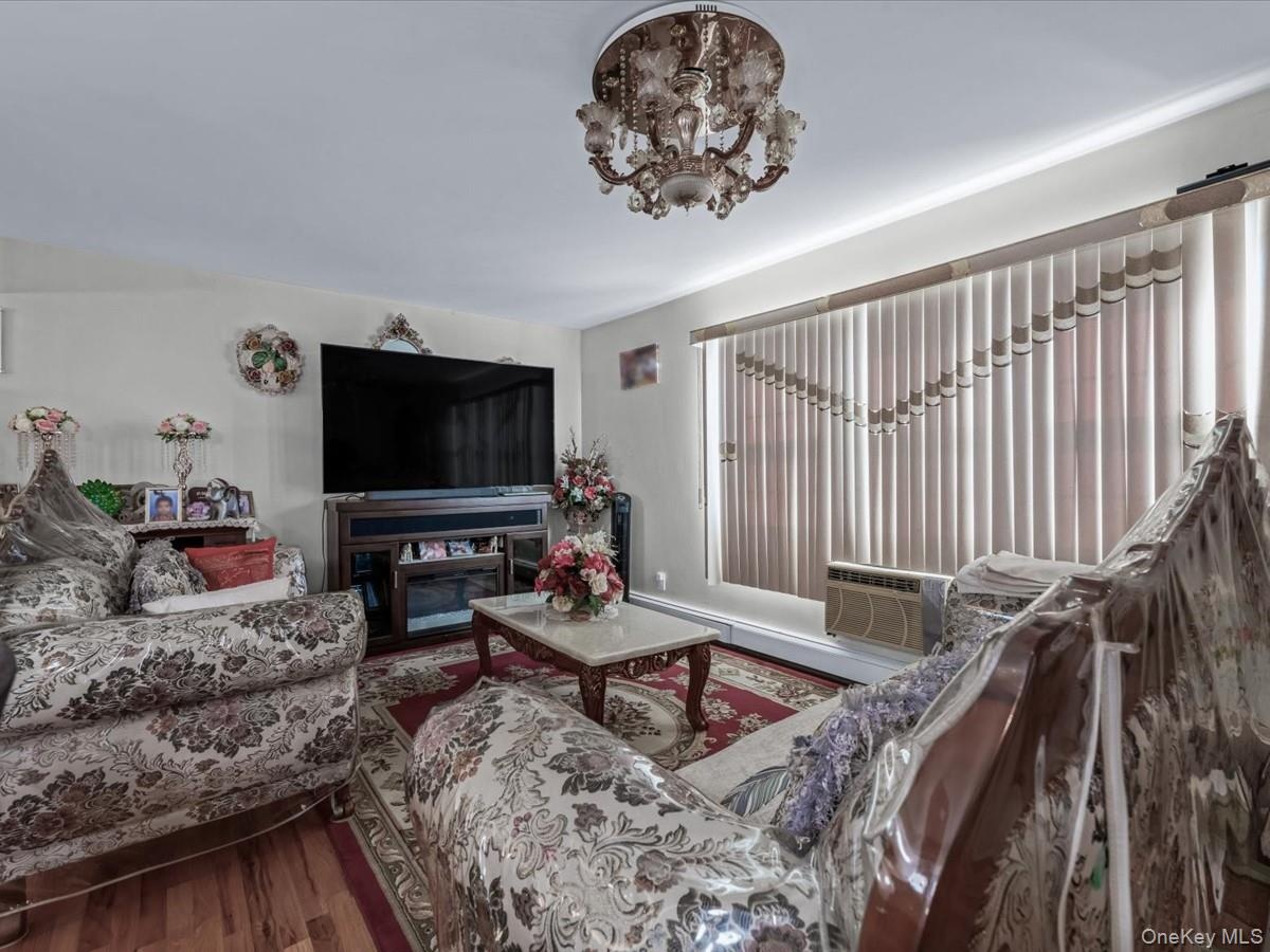 - Living area featuring a chandelier, wood finished floors, and stairway