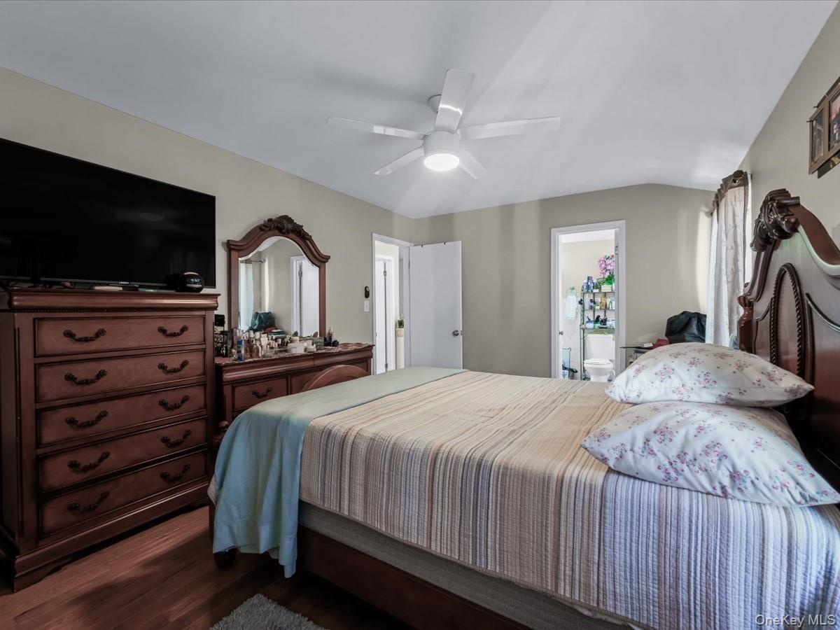 - Bedroom featuring wood-type flooring, ceiling fan, and vaulted ceiling