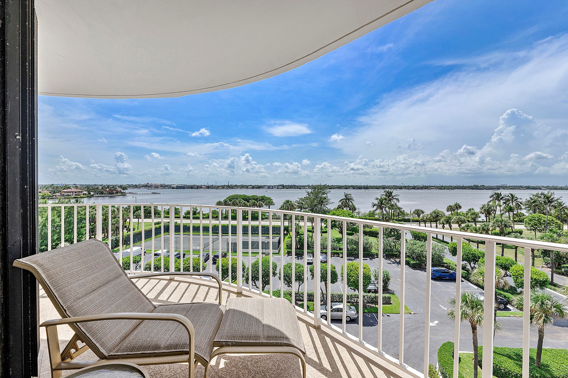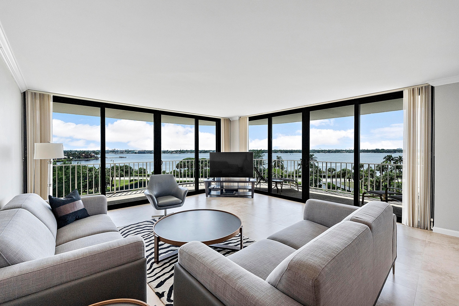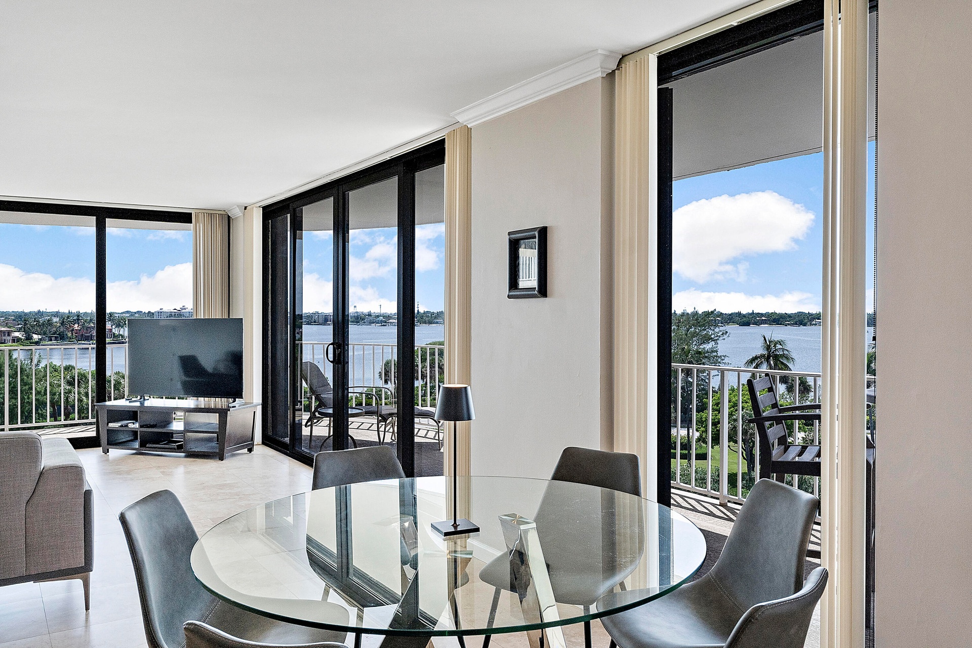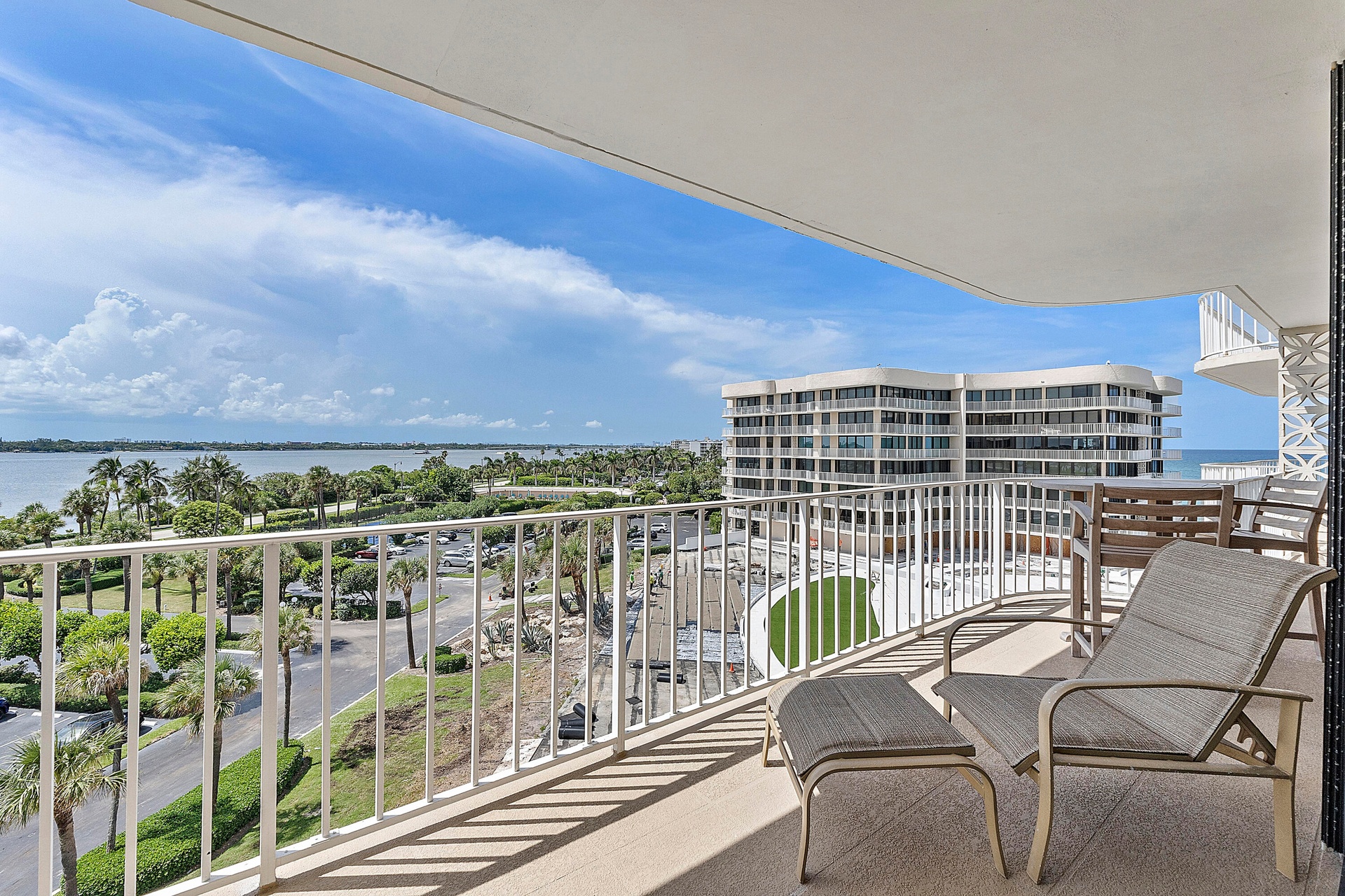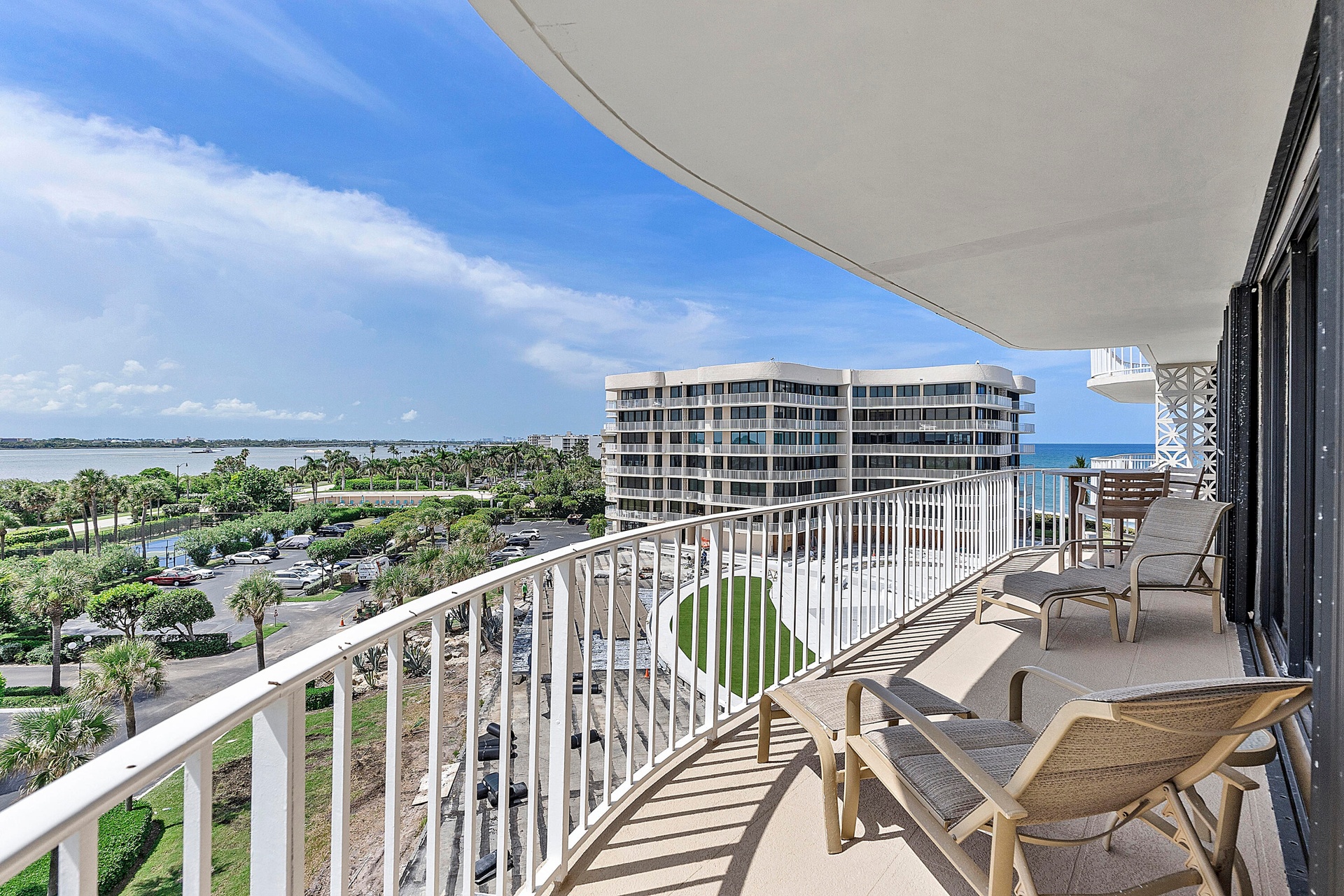 Fully furnished seasonal rental with panoramic views of the intracoastal and ocean with a wrap around private balcony.