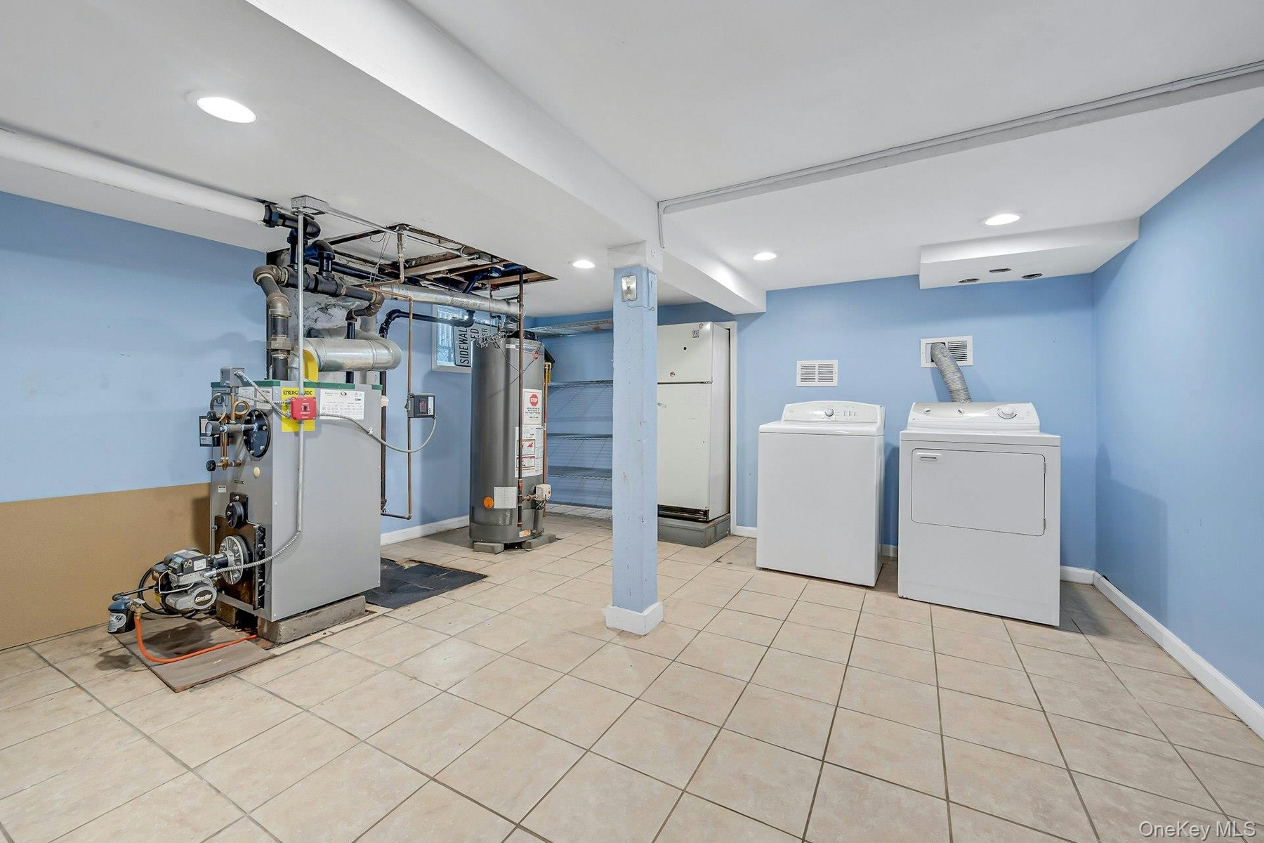 - Finished below grade area with washer and dryer, water heater, recessed lighting, tile patterned flooring, and a heating unit