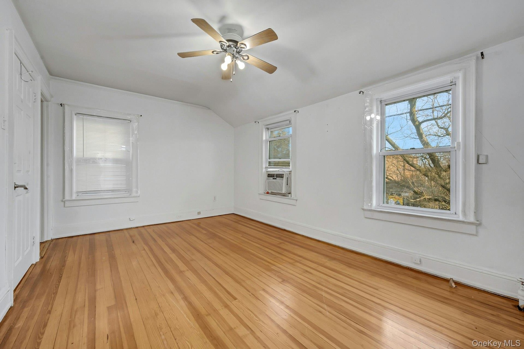 - Principal bedroom #1 with vaulted ceiling, radiator heating unit, wood-type flooring, a ceiling fan, and cooling unit