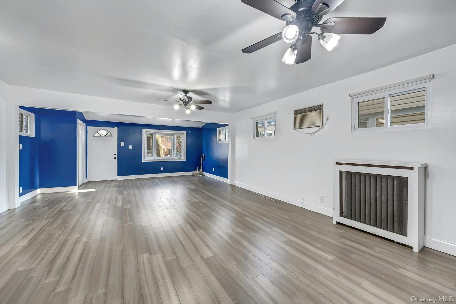 - Unfurnished living room featuring radiator heating unit, finished floors, ceiling fan, and a wall mounted air conditioner