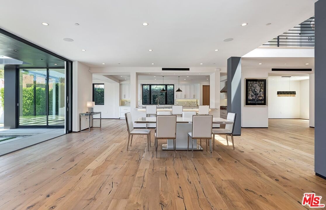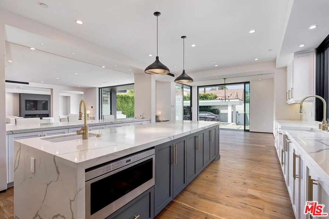 Built in 2017, this modern smart home in Beverly Grove blends sophisticated design with an open floor plan that defines contemporary California living. A dramatic 20-foot skylit entry floods the space with natural light, introducing sleek finishes, soaring ceilings, and wide-plank hardwood floors that flow throughout. The great room concept connects all the main living areas - private front office with patio, spacious family room with fireplace, inviting living room, open gourmet kitchen, and sunlit breakfast area - creating an effortless sense of space. The chef's kitchen is a true showpiece, featuring a large center island with bar seating, Sub-Zero side-by-side refrigerator/freezer, professional Wolf six-burner range with griddle, dual ovens, microwave drawer, and Bosch dishwasher. A wall of floor-to-ceiling glass pocket doors opens to a private backyard oasis with sparkling pool, grassy play area, and built-in grill - perfect for large-scale entertaining, intimate gatherings, or quiet evenings at home. Upstairs, the grand primary suite offers a fireplace, balcony overlooking the yard, custom walk-in closet, and spa-inspired bath with floating vanity, multi-head shower, and freestanding tub. Three additional en-suite bedrooms and an upstairs laundry room provide comfort and convenience.