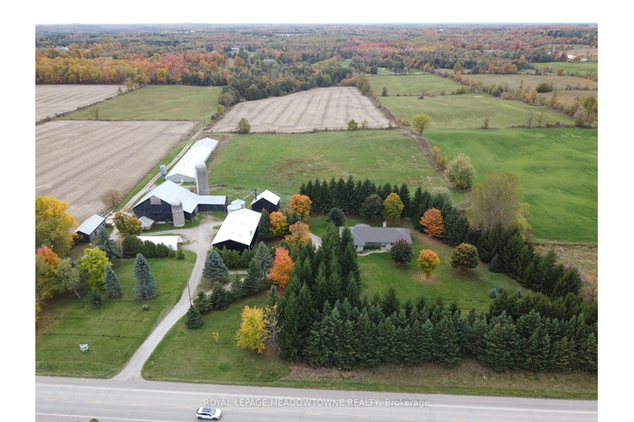 Once-in-a-Lifetime 98+ Acre Farm with Stunning Stone Bungalow & Barns. This exceptional 98+ acre property formerly a successful beef, dairy and poultry operation offers endless possibilities for farming, agribusiness, or event hosting. Set on a paved road just minutes from town conveniences and GO Train service, it combines rural beauty with outstanding accessibility. The 2,300 sq ft stone bungalow features 3 bedrooms, 4 bathrooms, a durable metal roof, and a walk-out basement perfect for a spacious in-law suite or rental income. Outbuildings include broiler barns and a magnificent bank barn, ready to support agricultural use or be transformed into a one-of-a-kind venue. Broiler Barn: 48 x 288 (13,824 sq ft) equipped with feed system, propane heaters, nipple waterers, and Big Dutchman feeders (all sold as-is). Bank Barn: 3,900+ sq ft in excellent condition, with capacity for 18,000 square bales, attached milk house, and additional storage shed- ideal for agricultural use or hosting events. Drive Shed: 40 x 80 with heated, insulated workshop, 16 ft ceilings, concrete floors, and crane. Additional structures include silos, coverall storage, feed tanks, utility shed, single garage, and multiple outbuildings. Land Use: 65+/- acres currently cash cropped (soybeans & winter wheat), with 25 acres in hay. 12 acres forested with mature maple trees potential for syrup production. Severance potential in southeast corner and some conservation restrictions. HST in addition to purchase price. Only minutes to Acton GO Station, shopping, golf course & services. Whether you envision hobby farming, cash cropping, poultry production or developing a horse ranch with paddocks, r create an event destination, or enjoy a private country retreat, the possibilities here are endless.