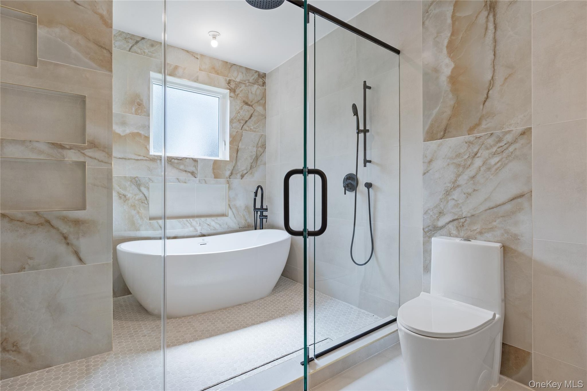 - Full bathroom featuring tile walls, a freestanding tub, and a walk in shower