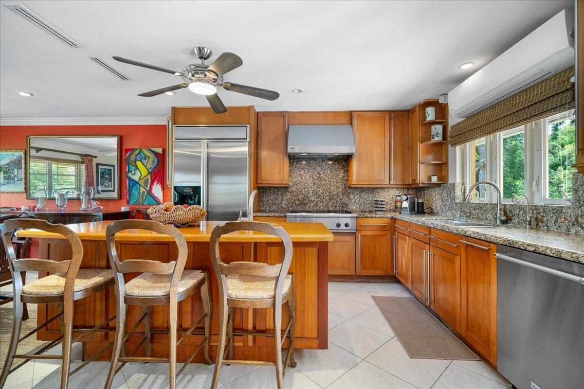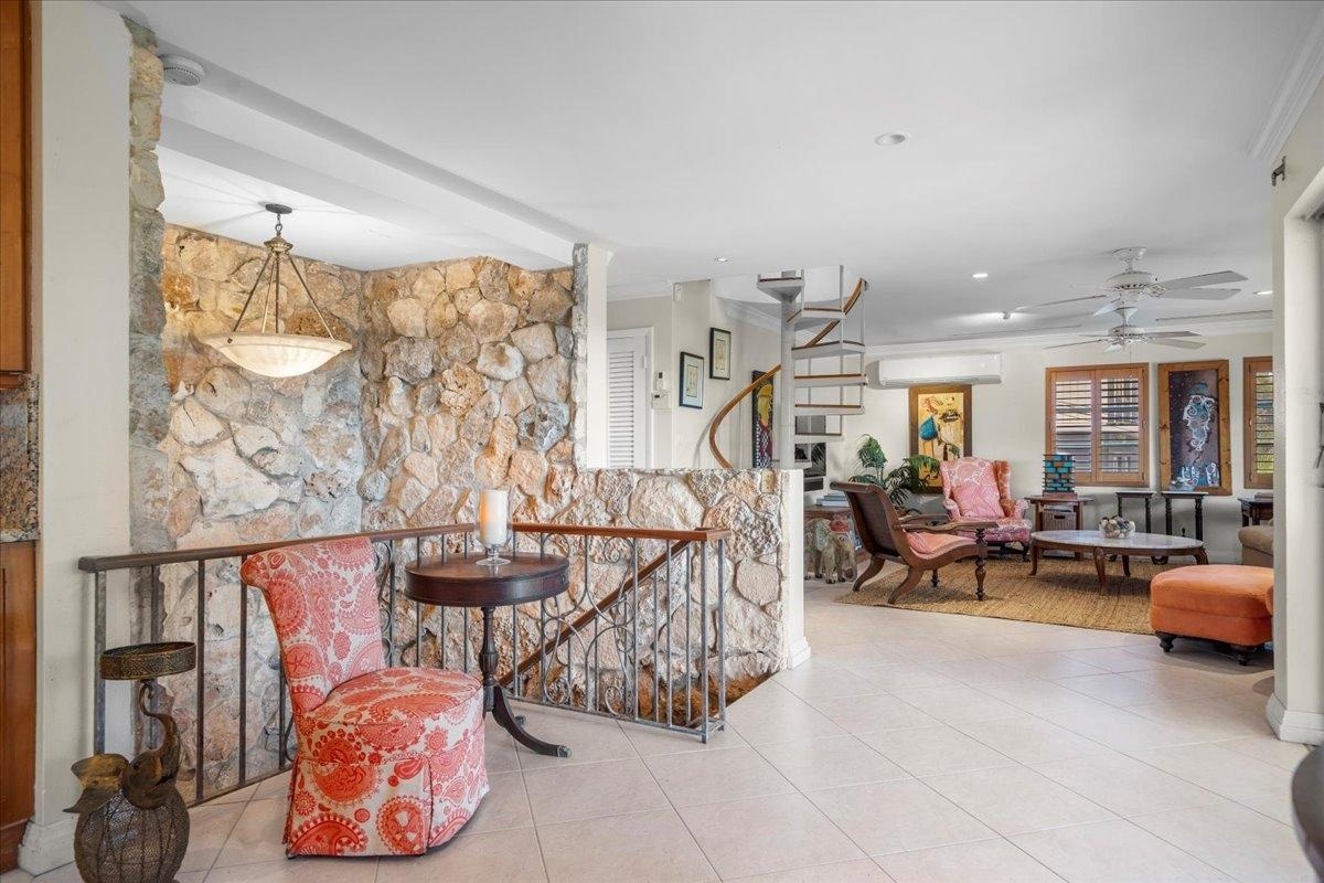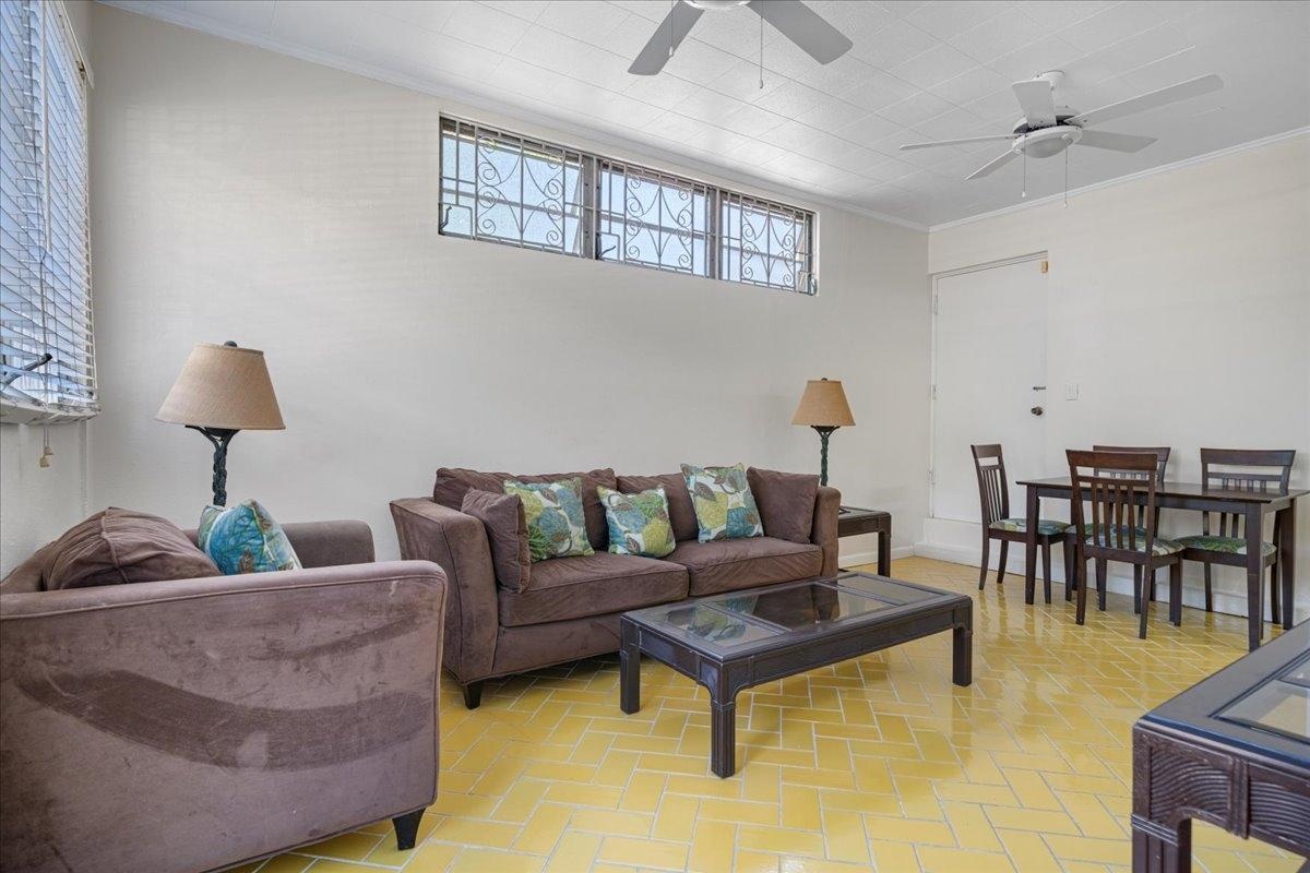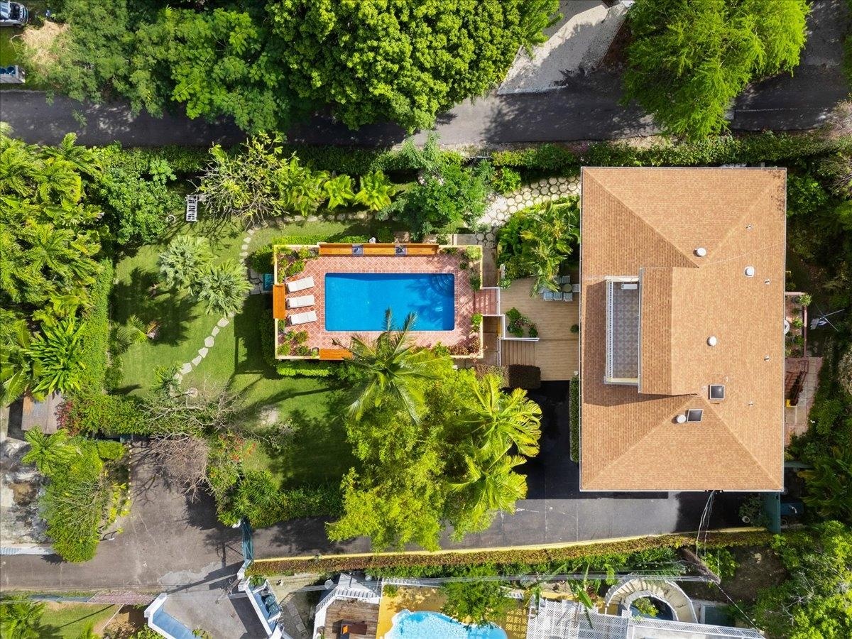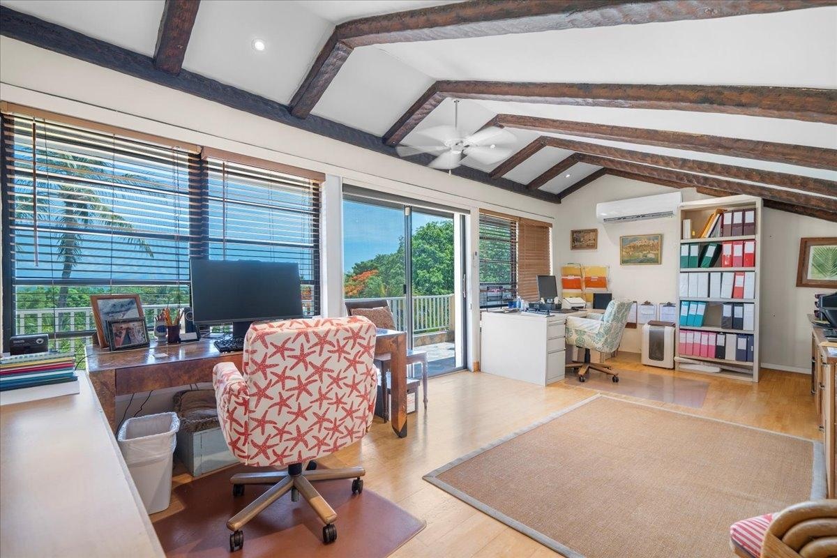 This fully enclosed, gated hilltop estate has sweeping ocean views, a tiled swimming pool and a strong, proven rental history. Nestled on a lushly landscaped 18,180 SF lot, this distinctive multi-level property offers charm, flexibility & privacy, just minutes from the shoreline. The main residence welcomes you with classic cut-stone walls, an open-concept layout, a thoughtfully designed kitchen flowing into the living space & covered balcony. This is the perfect spot to entertain, take in sunrises & sunsets. Originally a 4-bedroom home, the current 2-bed, 2-bath configuration can easily be restored to its original design. A third-floor home office with dramatic views could serve as a guest room, gym or studio. Outdoors, enjoy a private pool area surrounded by fruit trees, vibrant gardens with multiple dining and lounging areas. Three separately metered rental units add short, or long-term income opportunities. Extras include an automatic gated entry, 40KW generator, 17,300-gallon rainwater tank & so much more. This is an ideal property for those seeking both lifestyle & investment.