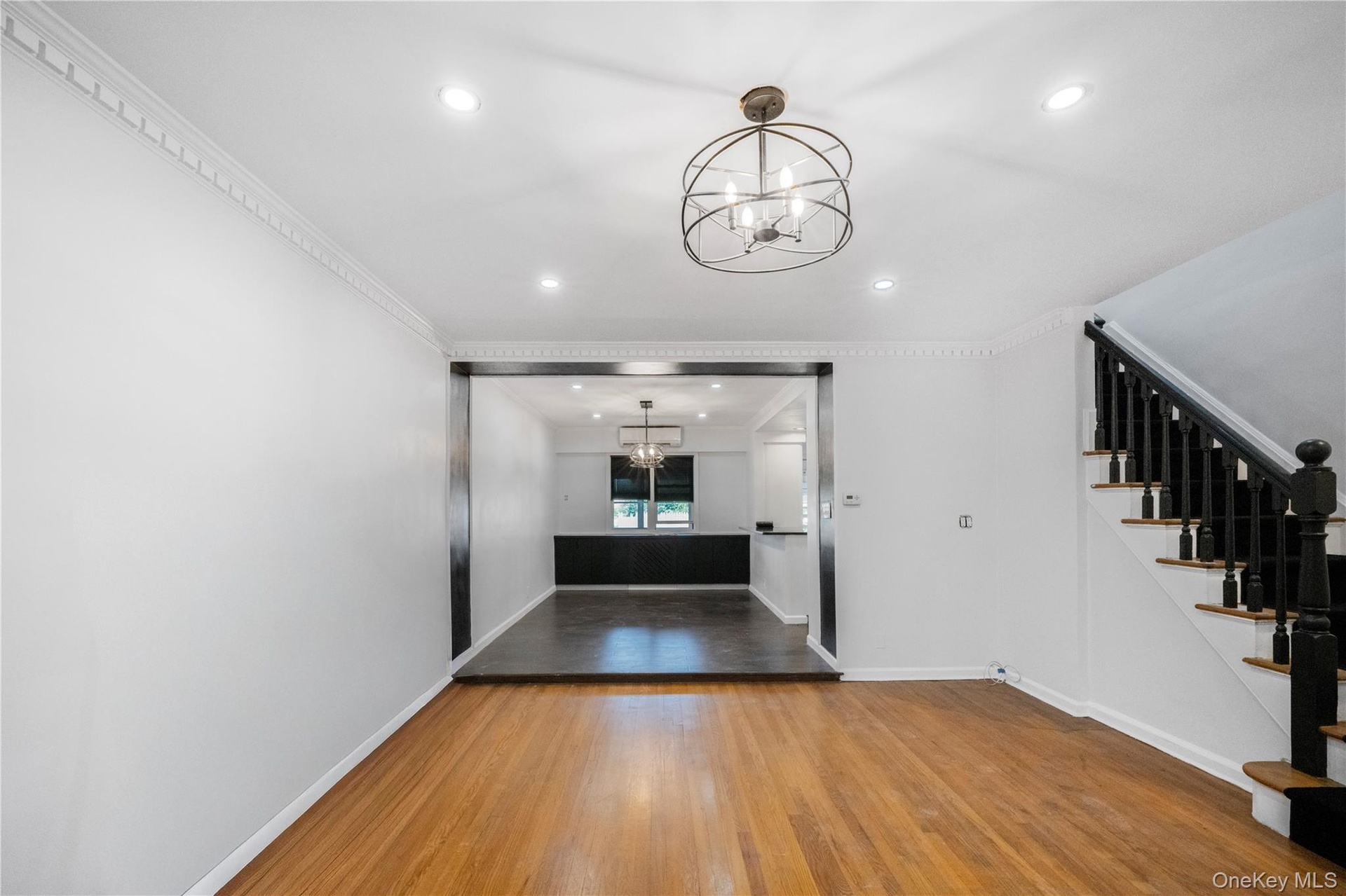 - Unfurnished living room with wood finished floors, stairs, a chandelier, crown molding, and recessed lighting