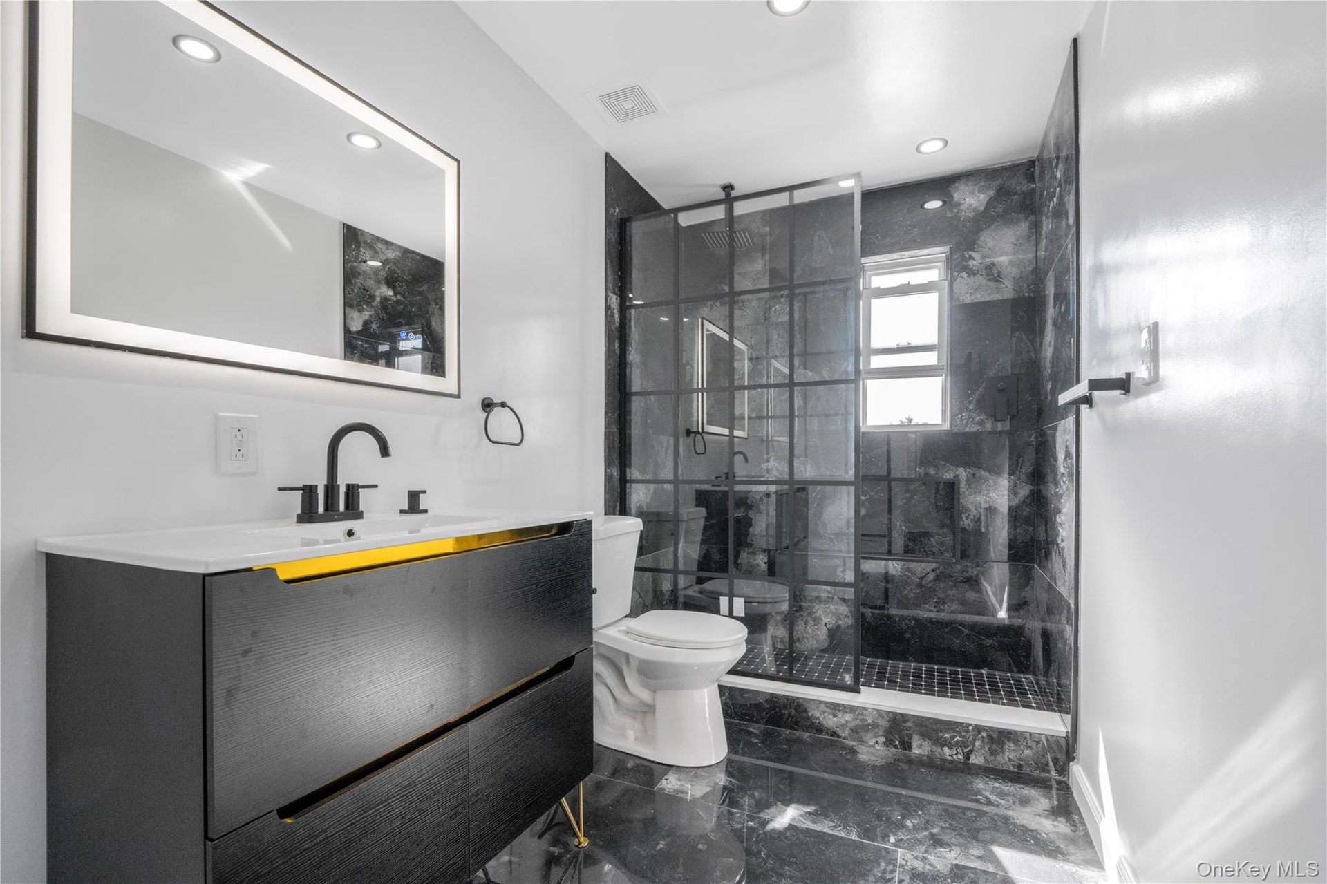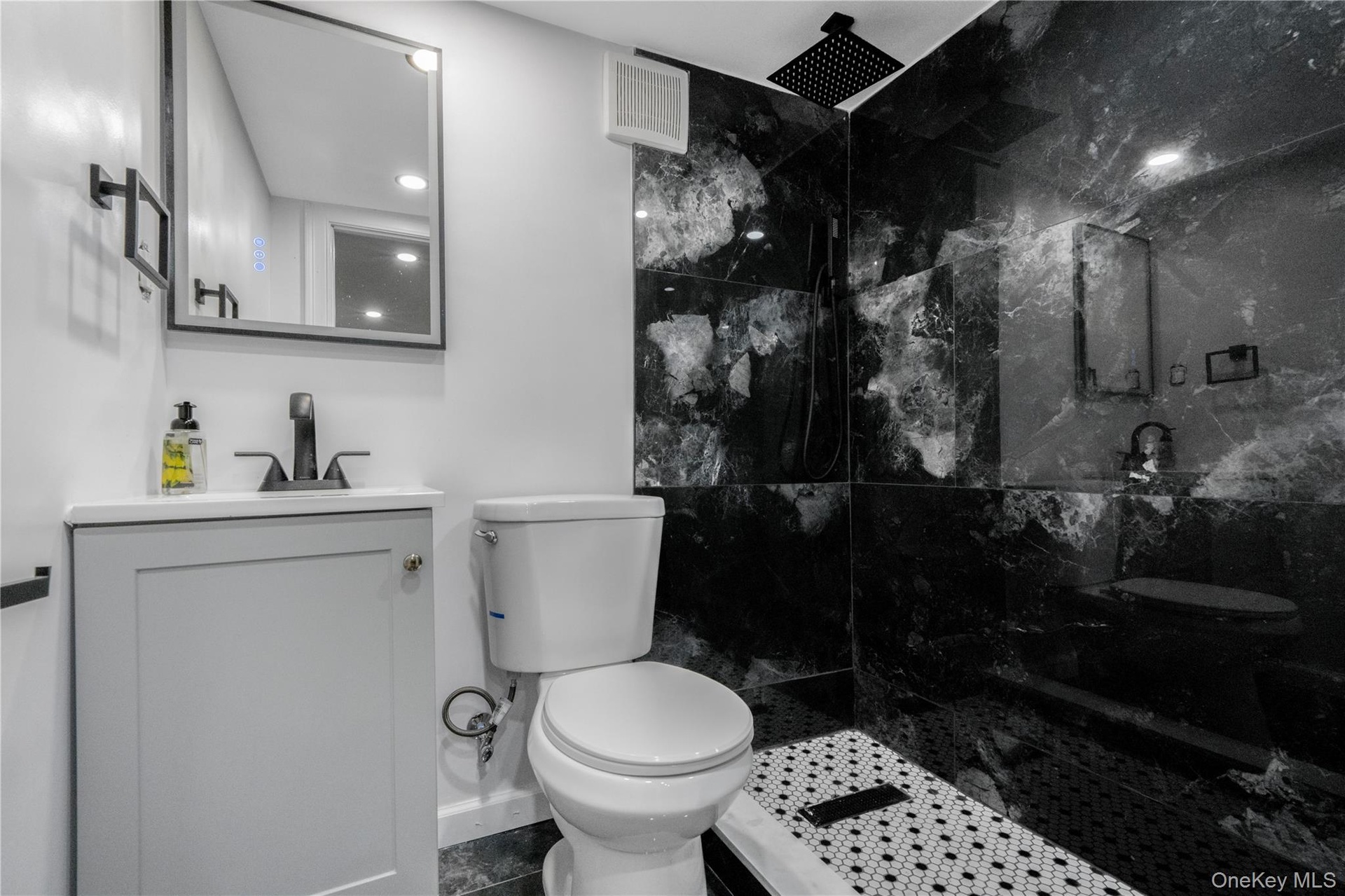 - Bathroom featuring vanity, a walk in shower, dark marble finish flooring, and recessed lighting