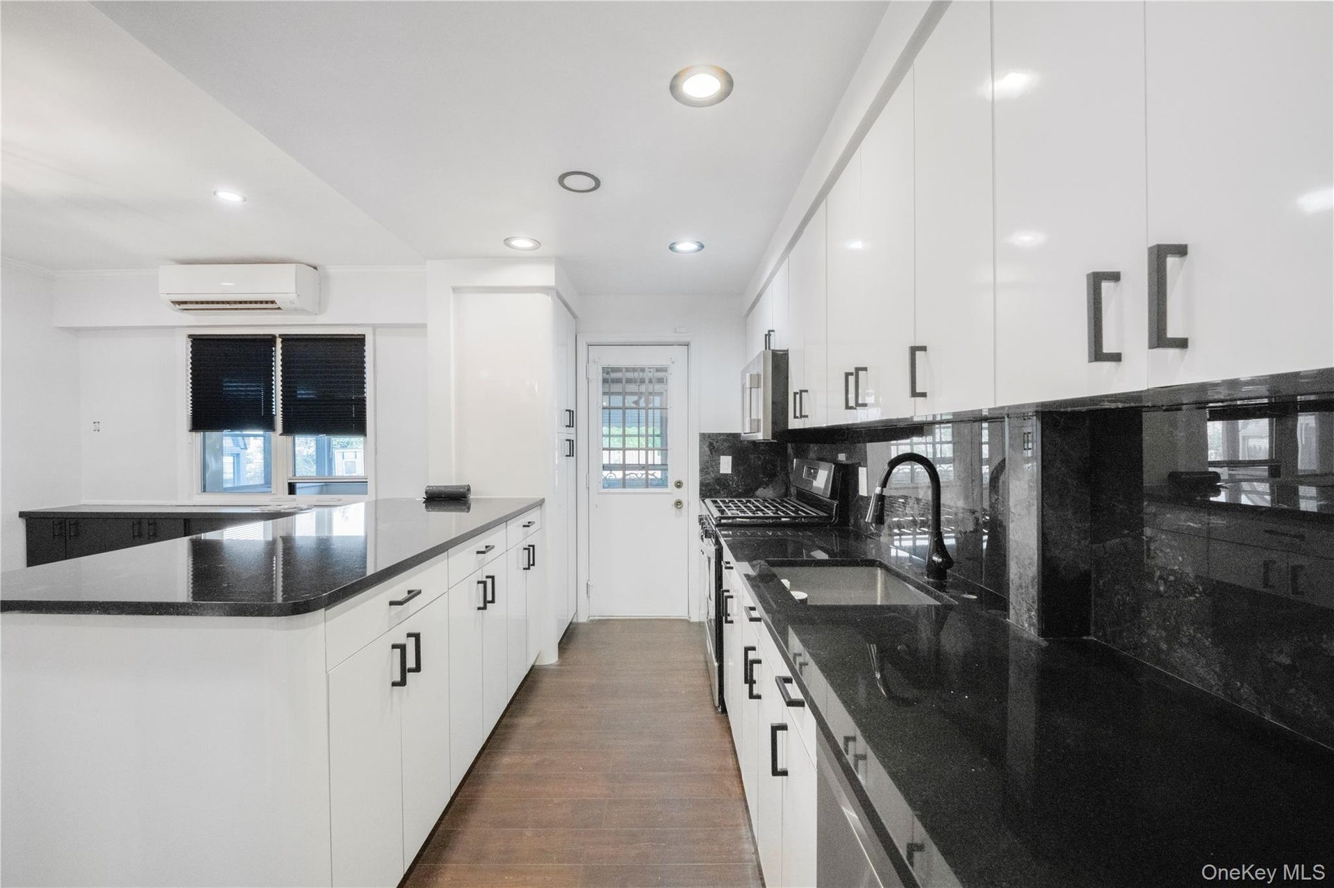- Kitchen with dark stone countertops, a peninsula, white cabinets, gas stove, and recessed lighting