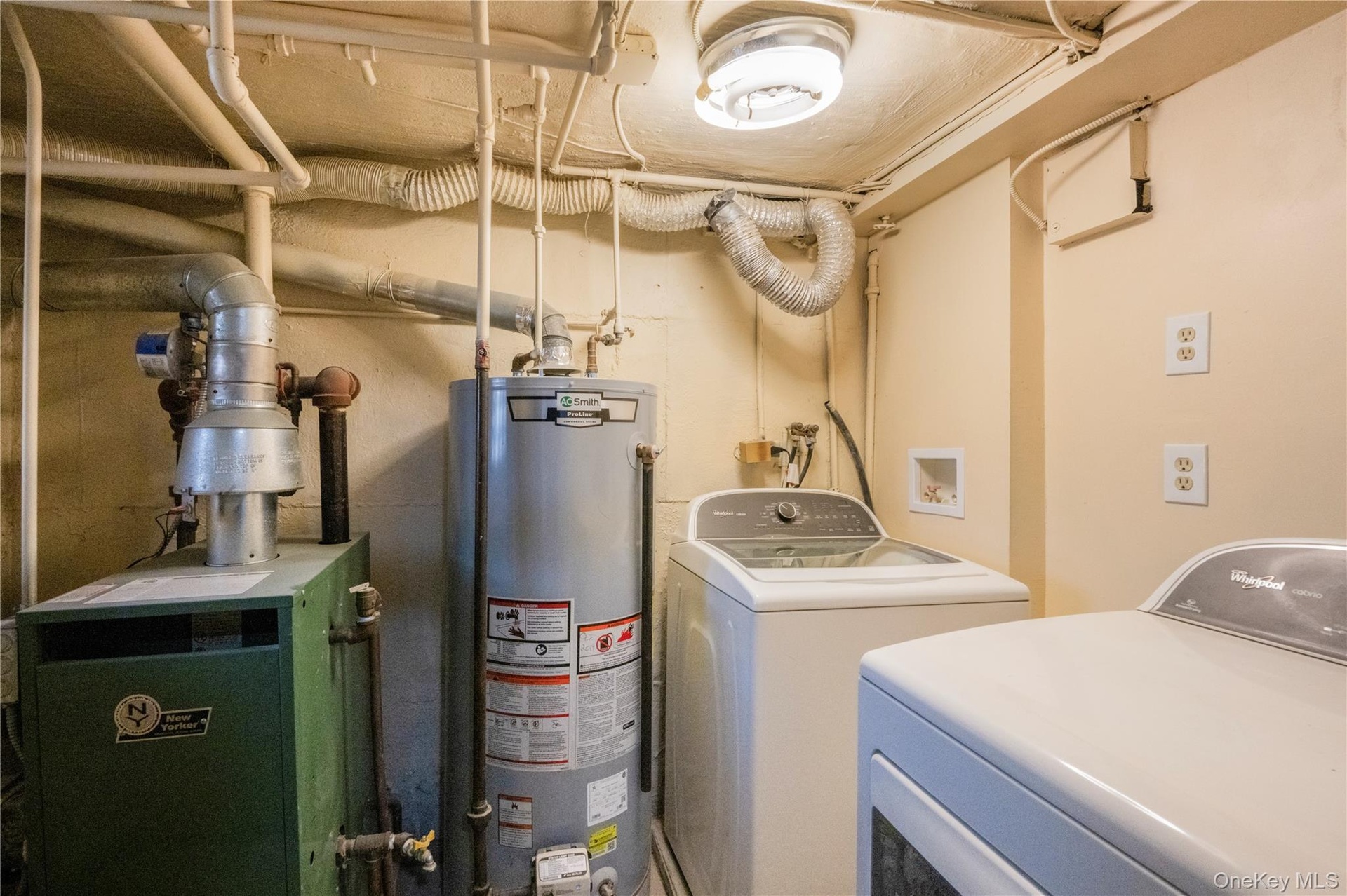 - Washroom featuring gas water heater and washing machine and dryer