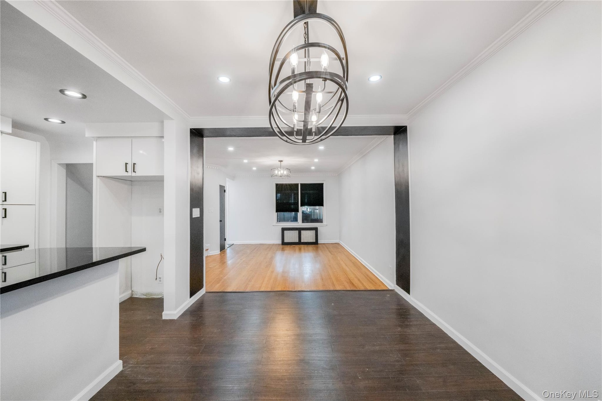 - Unfurnished dining area featuring dark wood finished floors, ornamental molding, a chandelier, and recessed lighting