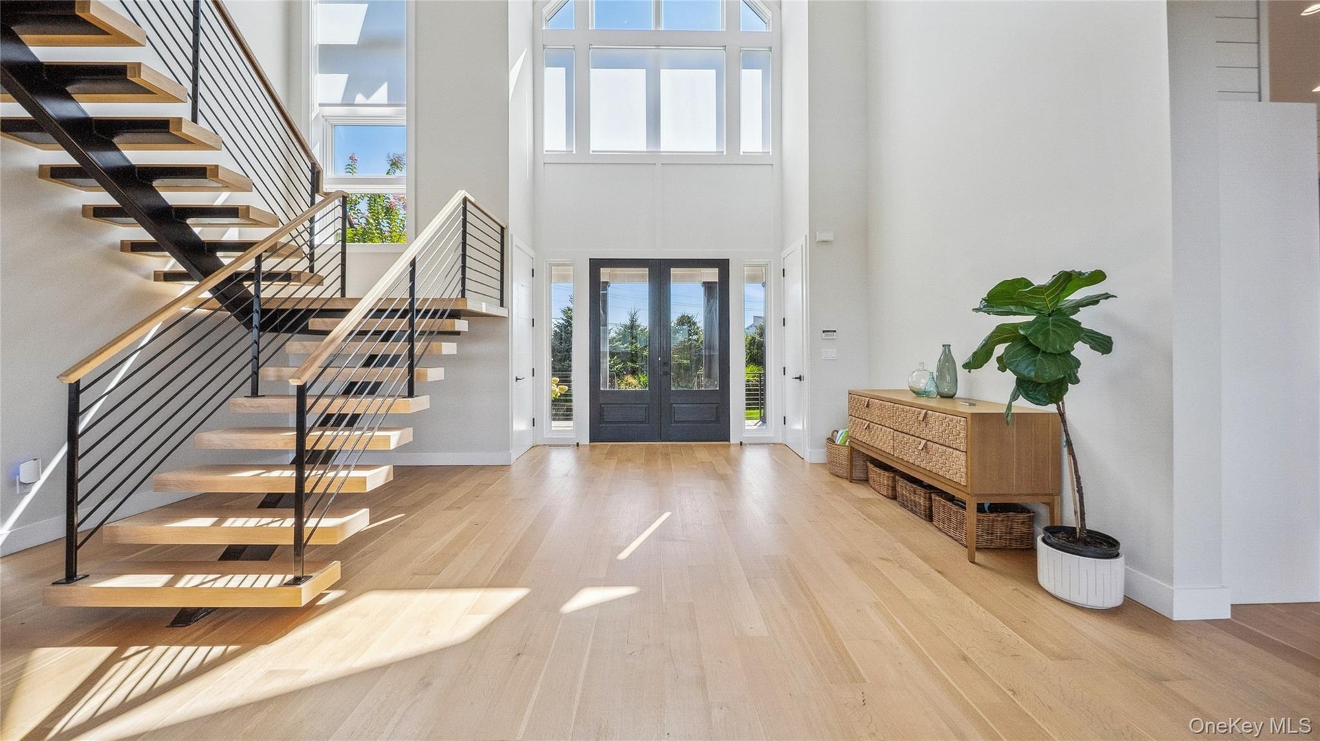 - Entryway with french doors, light wood-style flooring, stairs, and a towering ceiling