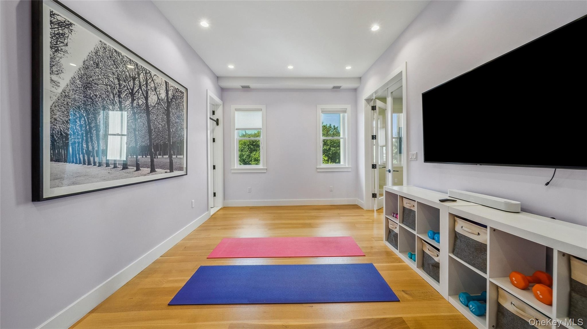 - Exercise area with light wood-type flooring and recessed lighting
