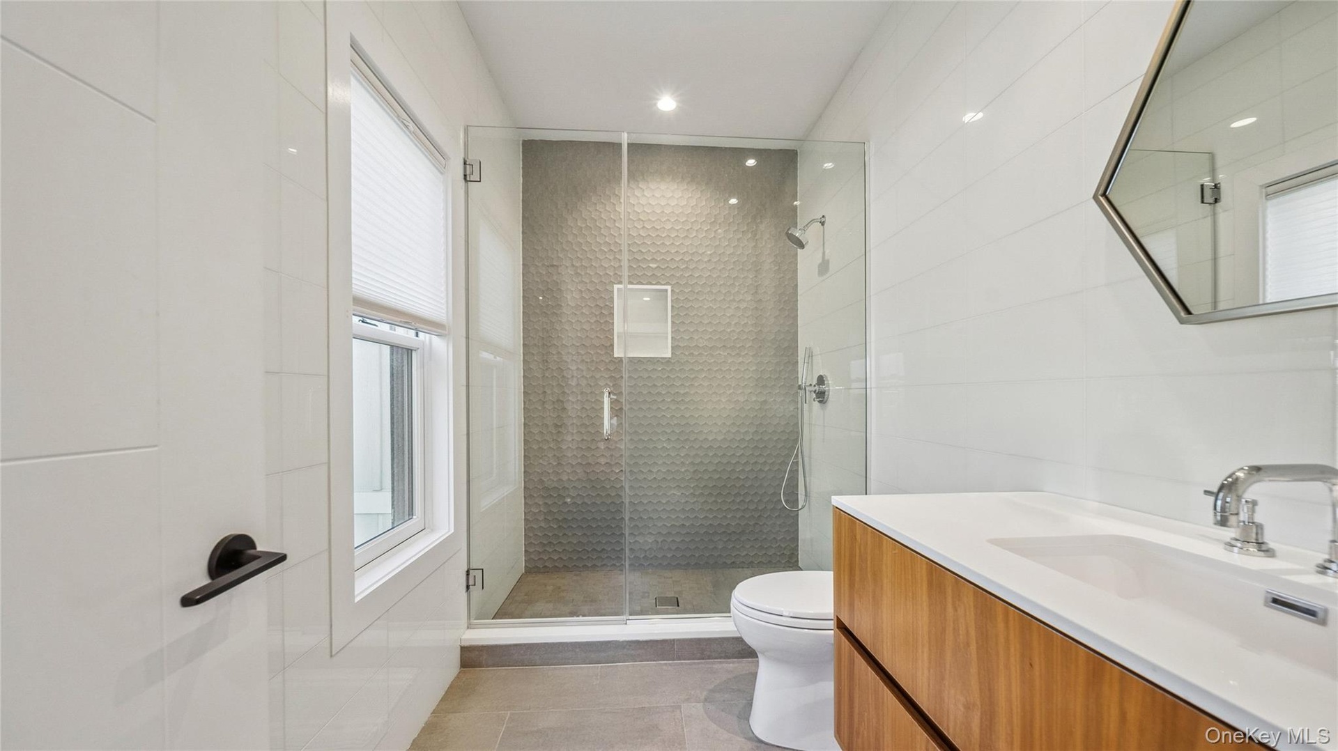 - Bathroom featuring a shower stall, vanity, and recessed lighting