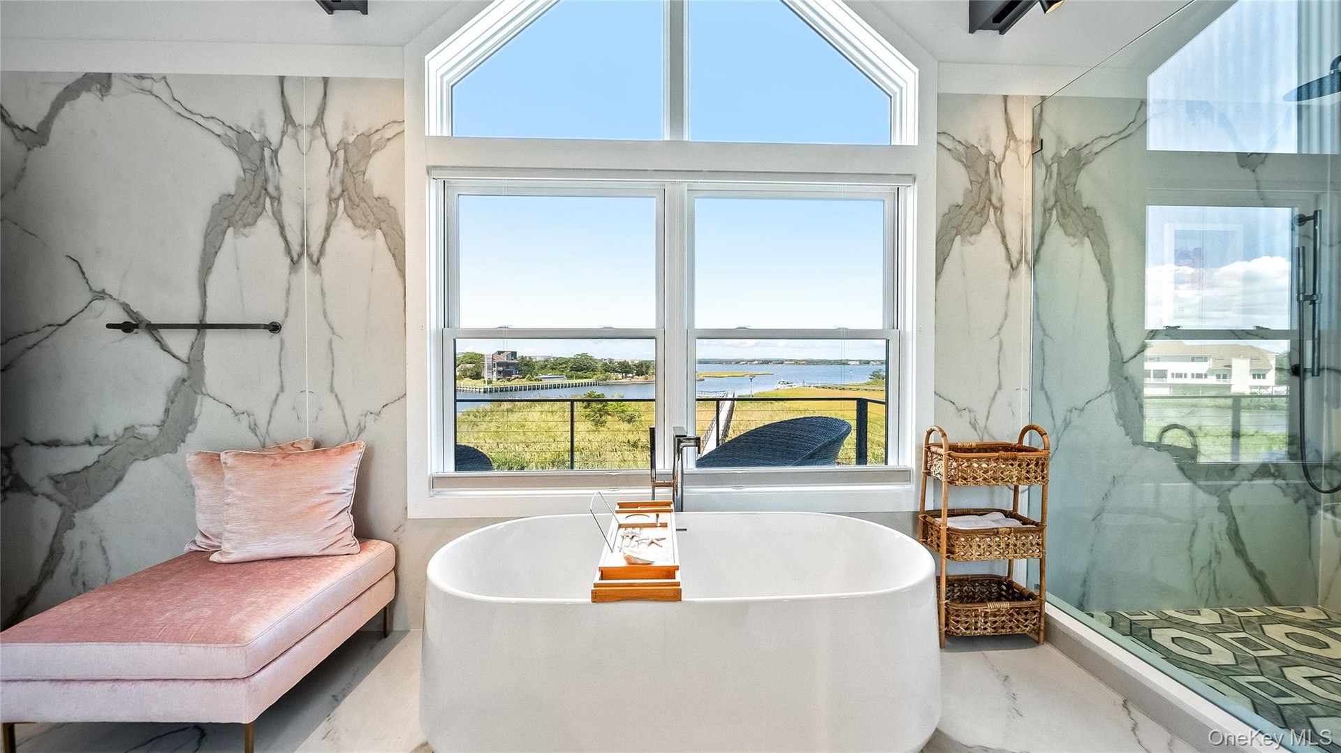 - Full bathroom with a water view, healthy amount of natural light, a freestanding bath, and a marble finish shower