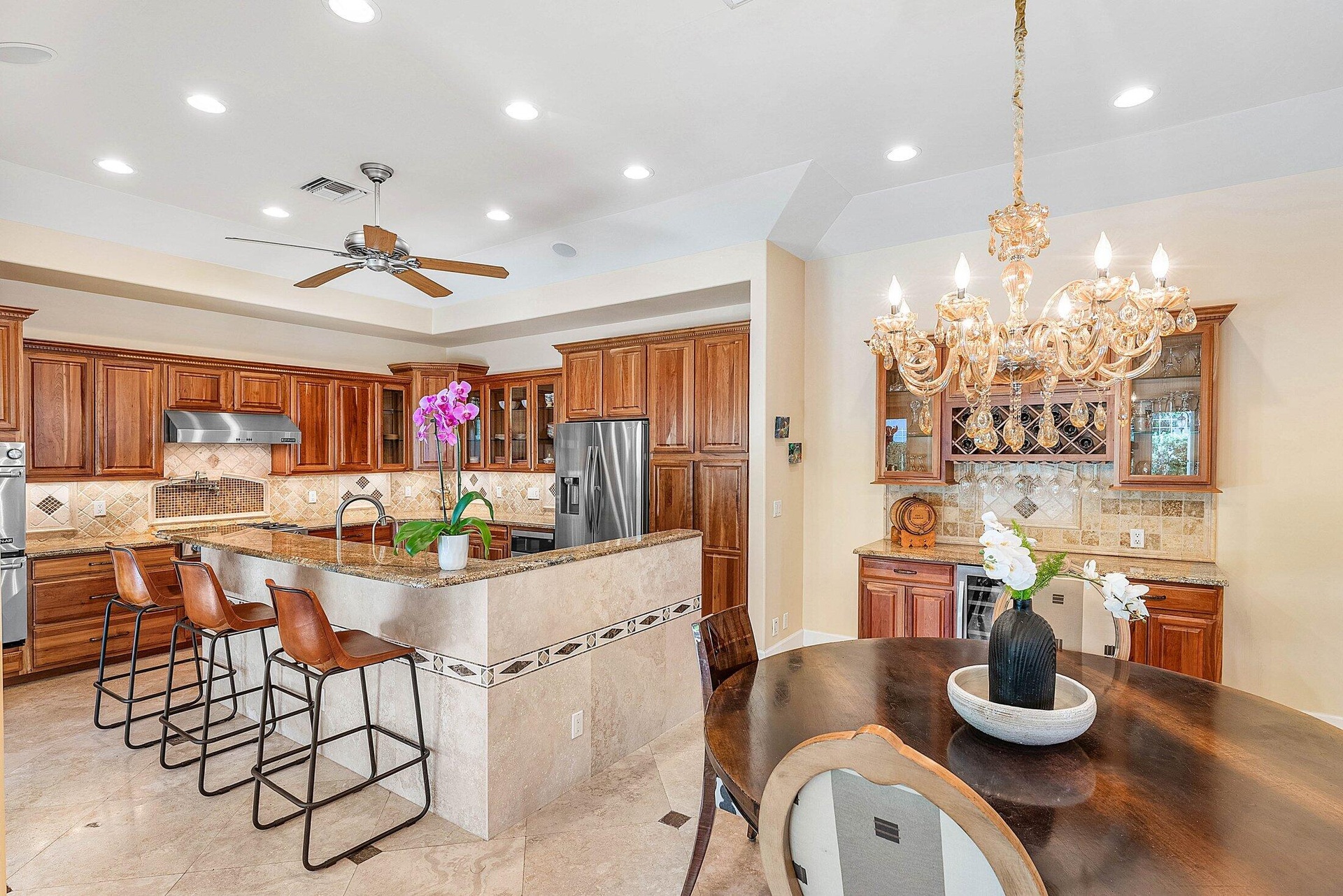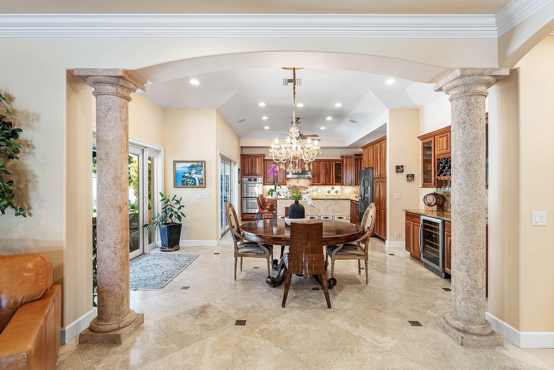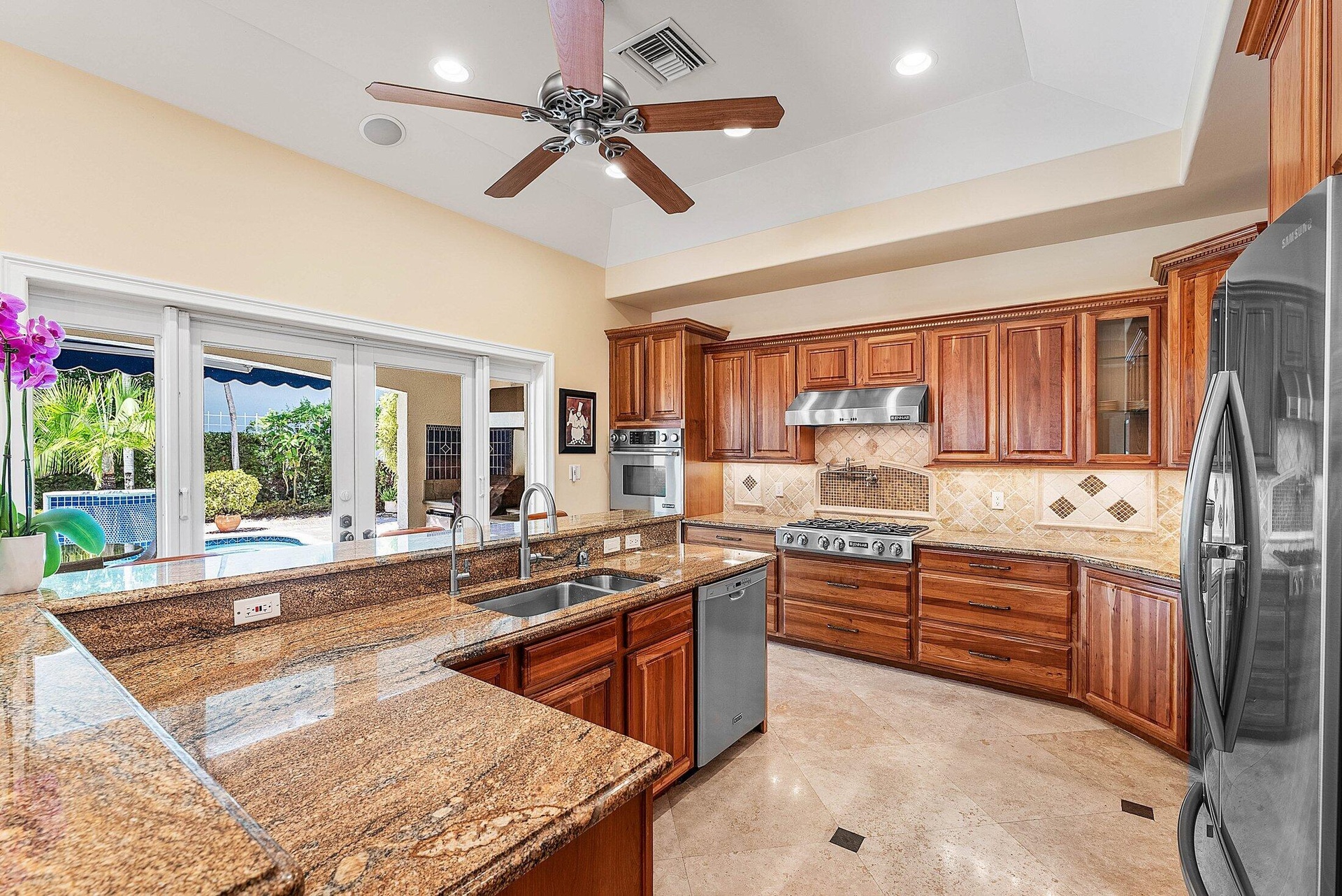 DescriptionExquisite 3BR/3BA custom home designed by a renowned local architect and built by its engineer-owner. Offering 2,206 SF under air (2,936 total) on a .21-acre lot, this property boasts PGT impact windows and doors, barrel tile roof, Kohler whole-house generator, two newer AC units with UV lighting, and no HOA.Interior highlights include 10-12 ft ceilings, 24x24 travertine floors, crown molding, coffered and tray ceilings, solid core doors, bar with wine cooler, central vac, and cedar-lined closets. The gourmet kitchen features granite counters, cherry cabinetry, professional 6-burner Jenn Air gas cooktop with pot filler, dual convection ovens, and pantry with pull-outs.The luxurious primary suite offers French doors to the pool, a spa bath with onyx vanities, Jacuzzi tub,