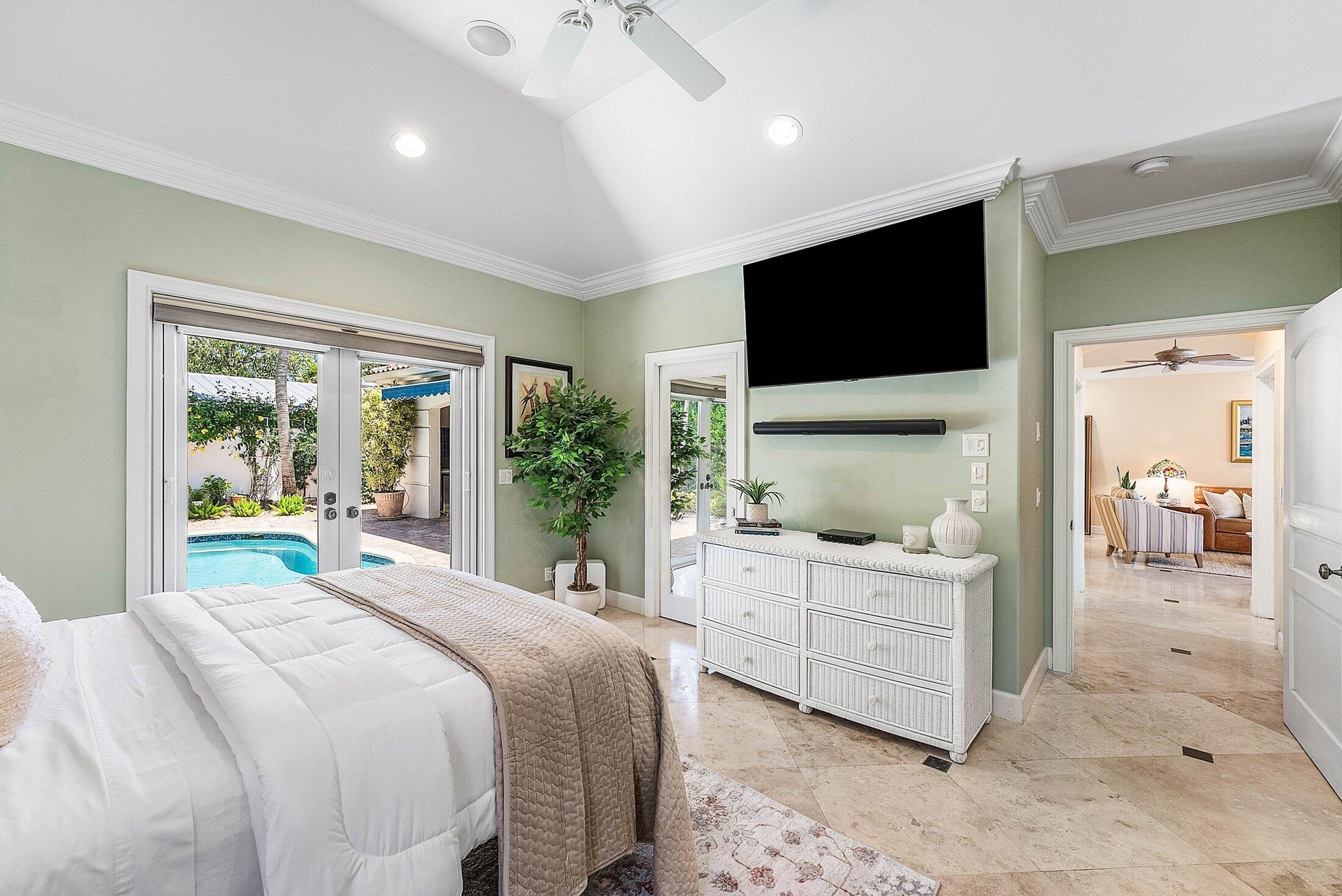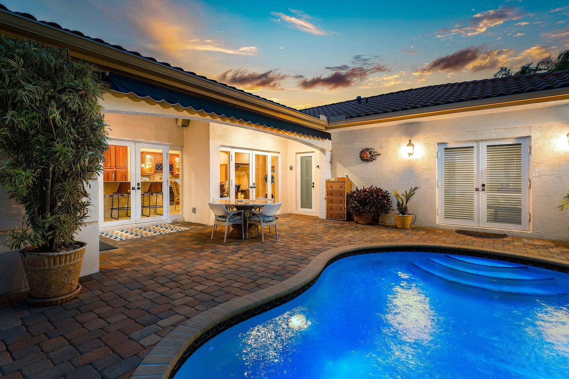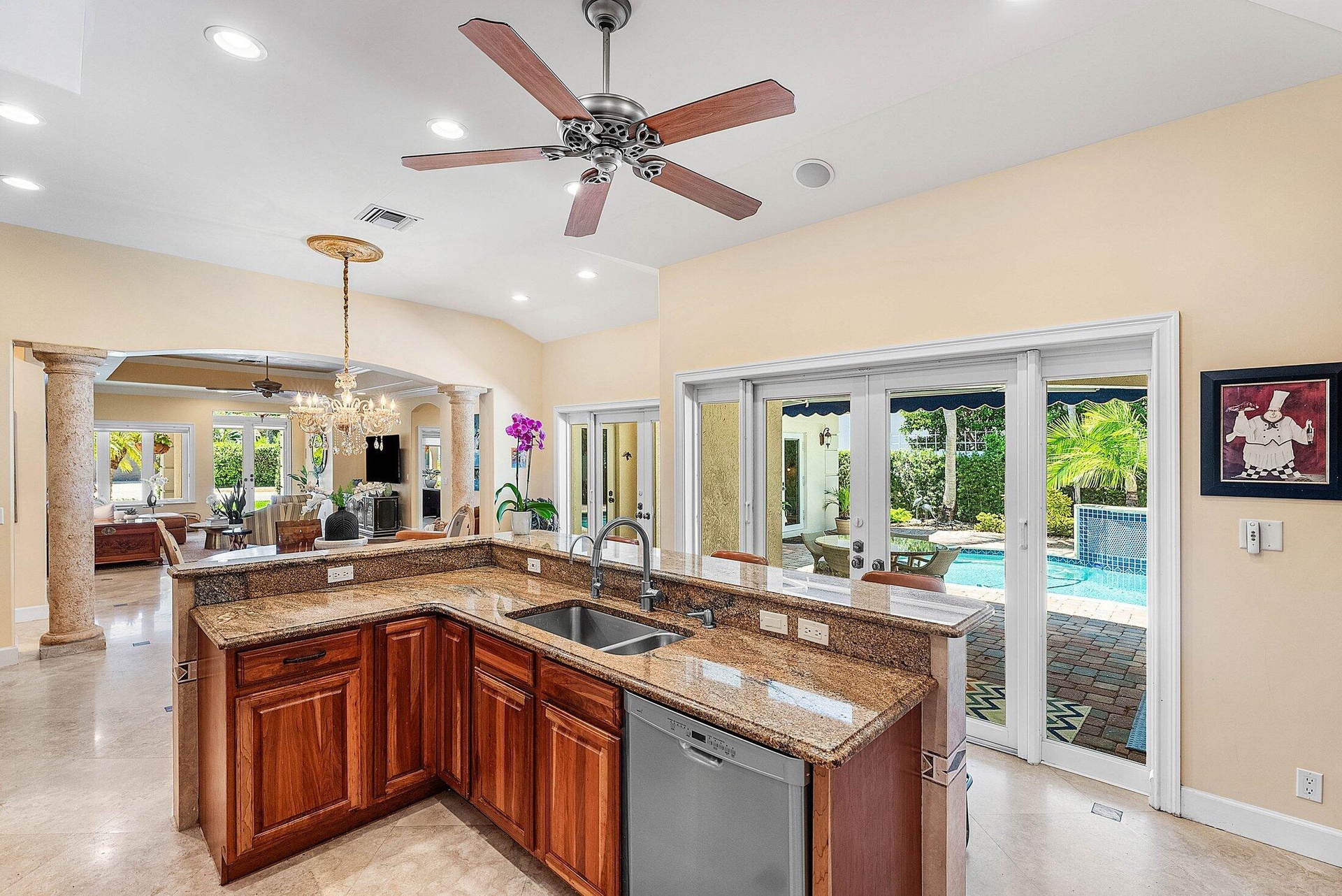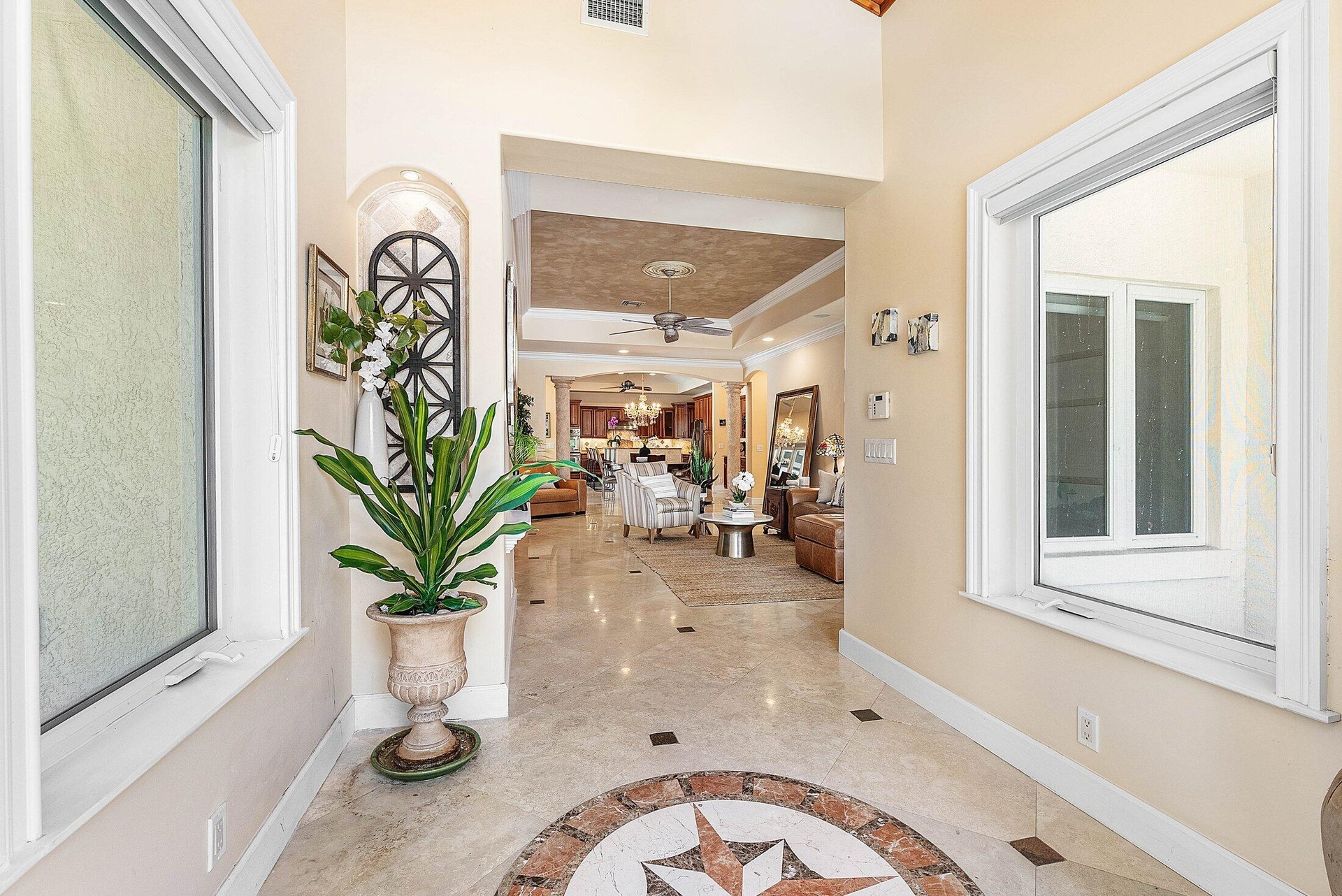 DescriptionExquisite 3BR/3BA custom home designed by a renowned local architect and built by its engineer-owner. Offering 2,206 SF under air (2,936 total) on a .21-acre lot, this property boasts PGT impact windows and doors, barrel tile roof, Kohler whole-house generator, two newer AC units with UV lighting, and no HOA.Interior highlights include 10-12 ft ceilings, 24x24 travertine floors, crown molding, coffered and tray ceilings, solid core doors, bar with wine cooler, central vac, and cedar-lined closets. The gourmet kitchen features granite counters, cherry cabinetry, professional 6-burner Jenn Air gas cooktop with pot filler, dual convection ovens, and pantry with pull-outs.The luxurious primary suite offers French doors to the pool, a spa bath with onyx vanities, Jacuzzi tub,