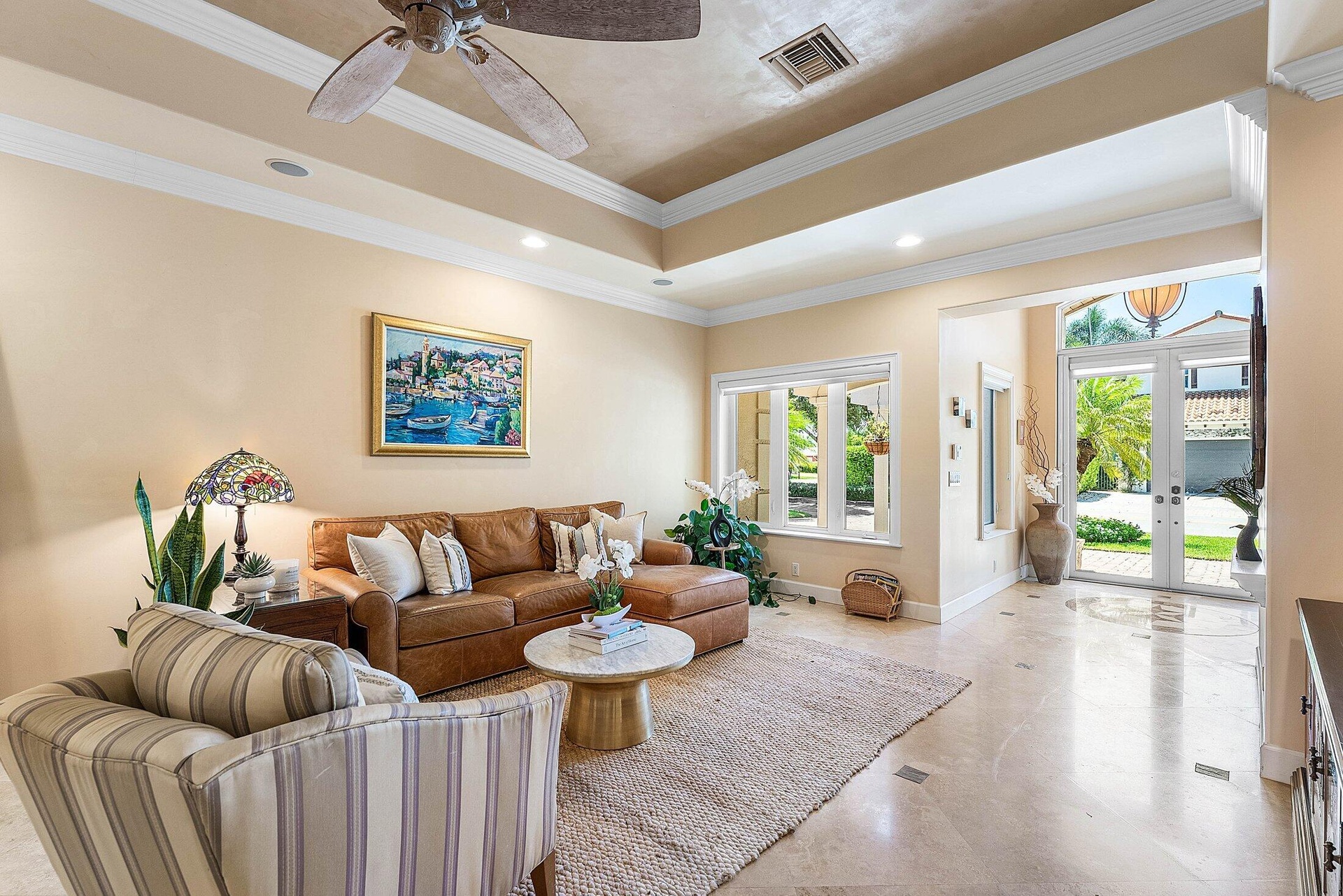 Exquisite 3BR/3BA custom home designed by a renowned local architect and built by its engineer-owner. Offering 2,206 SF under air (2,936 total) on a .21-acre lot, this property boasts PGT impact windows and doors, barrel tile roof, Kohler whole-house generator, two newer AC units with UV lighting, and no HOA.Interior highlights include 10-12 ft ceilings, 24x24 travertine floors, crown molding, coffered and tray ceilings, solid core doors, bar with wine cooler, central vac, and cedar-lined closets. The gourmet kitchen features granite counters, cherry cabinetry, professional 6-burner Jenn Air gas cooktop with pot filler, dual convection ovens, and pantry with pull-outs.The luxurious primary suite offers French doors to the pool, a spa bath with onyx vanities, Jacuzzi tub,