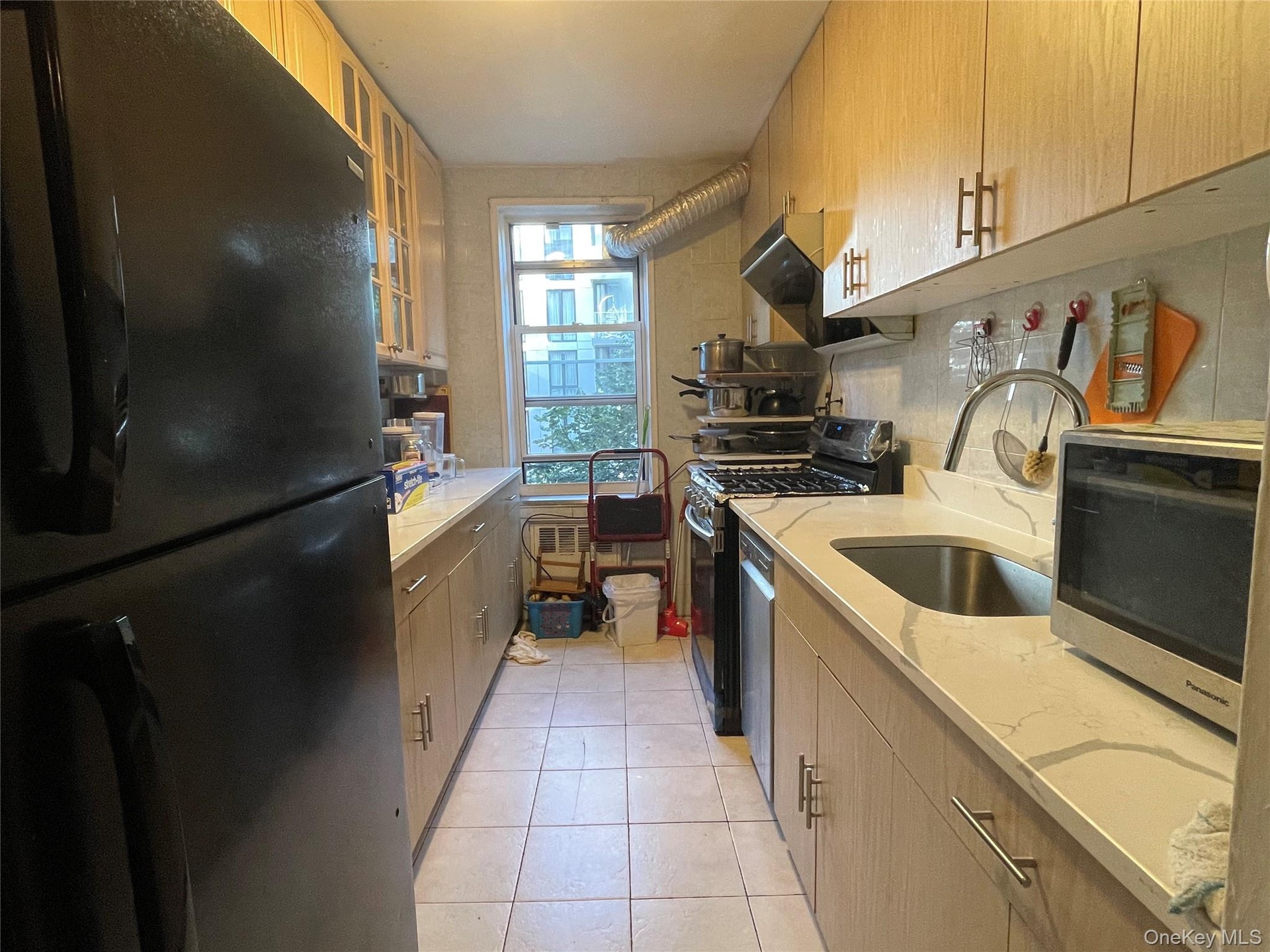 - Kitchen with black appliances, exhaust hood, light tile patterned flooring, light stone countertops, and glass insert cabinets