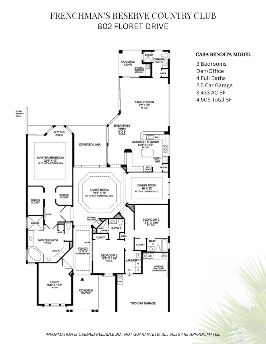 DescriptionYour serene garden home awaits. Fabulous value for a single family home located in the well located and highly sought after country club community of Frenchman's Reserve. This lovely inviting 3 bedroom + den/office and 4 full bath Casa Bendita model home features tranquil long lake & course view and is ready to become your very own. Completed with lovely signature finishes throughout this spectacular residence has been lightly lived in and lovingly maintained. The beautiful newly completed inviting pavered drive/entryway opens to wonderful pool, lake & course views all highlighted by captivating tropical landscaping. Delight in the scenic garden views from the primary suite and throughout the main living spaces. An absolutely perfect home for family gatherings and guests.