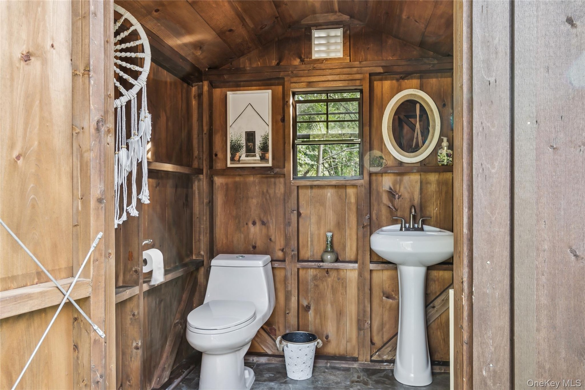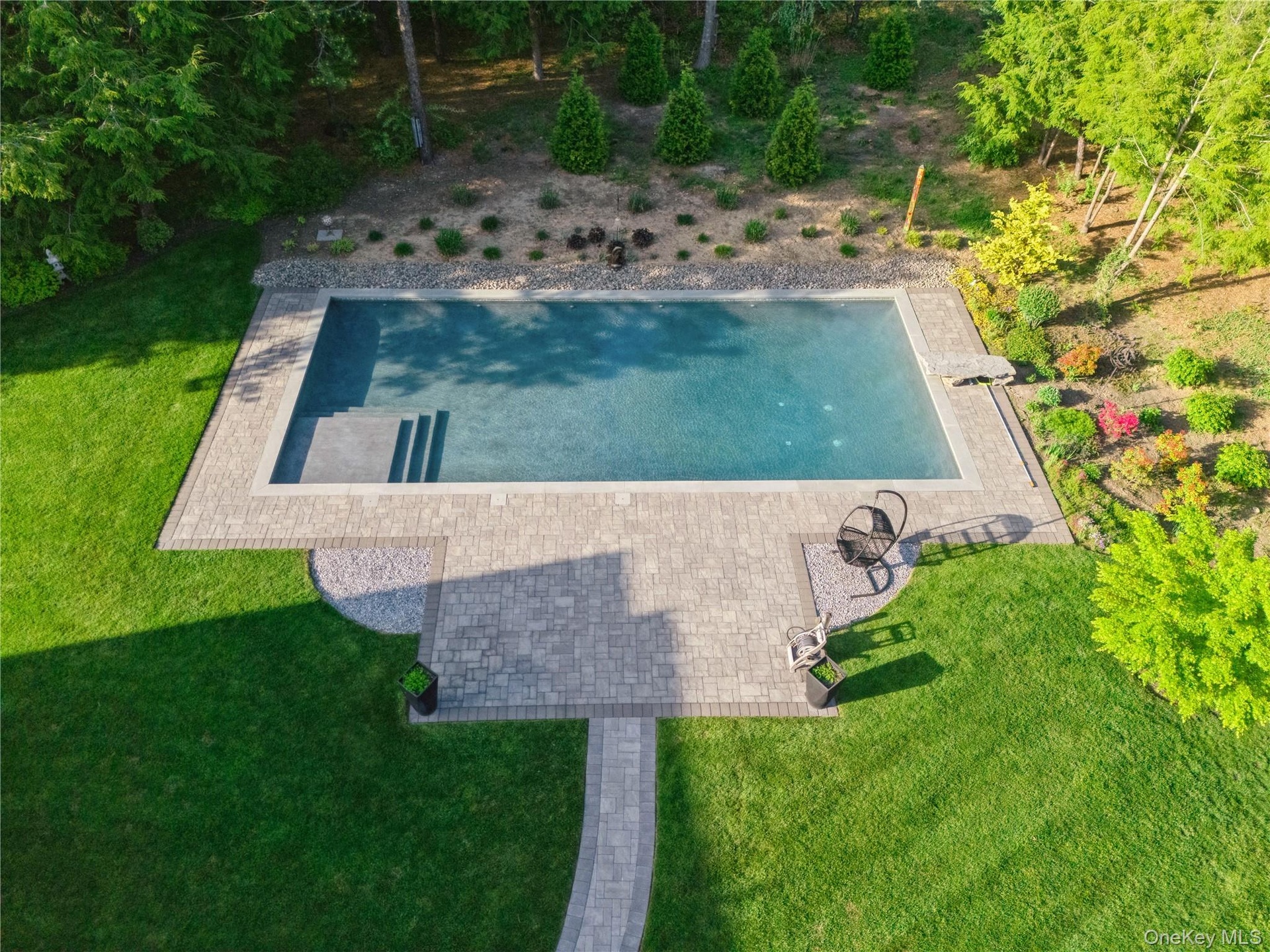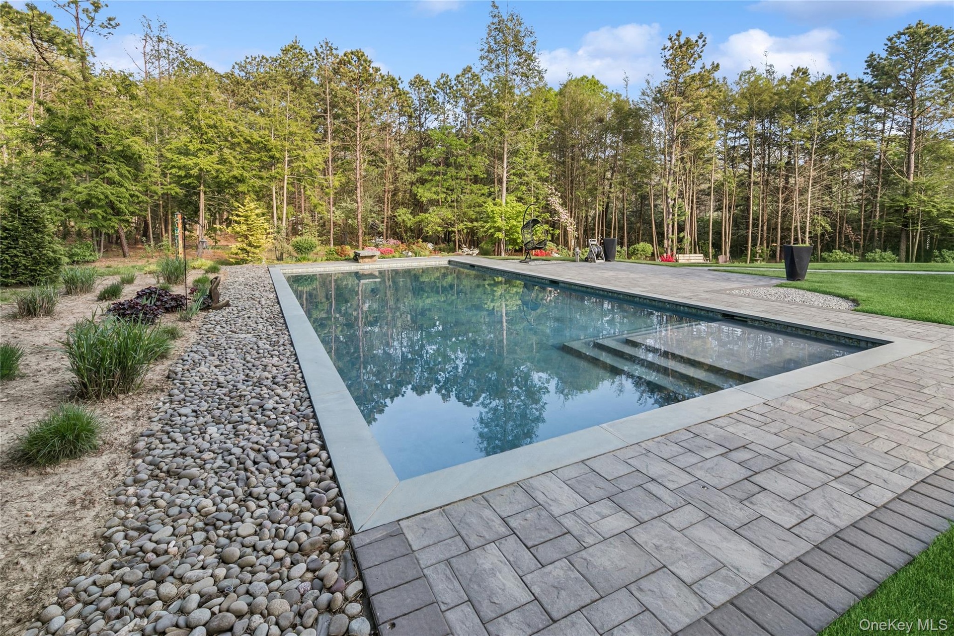 space overlooks the heated saltwater 22’ x 44’ Gunite pool, surrounded by peaceful landscaping and natural beauty. An outdoor full bath adds