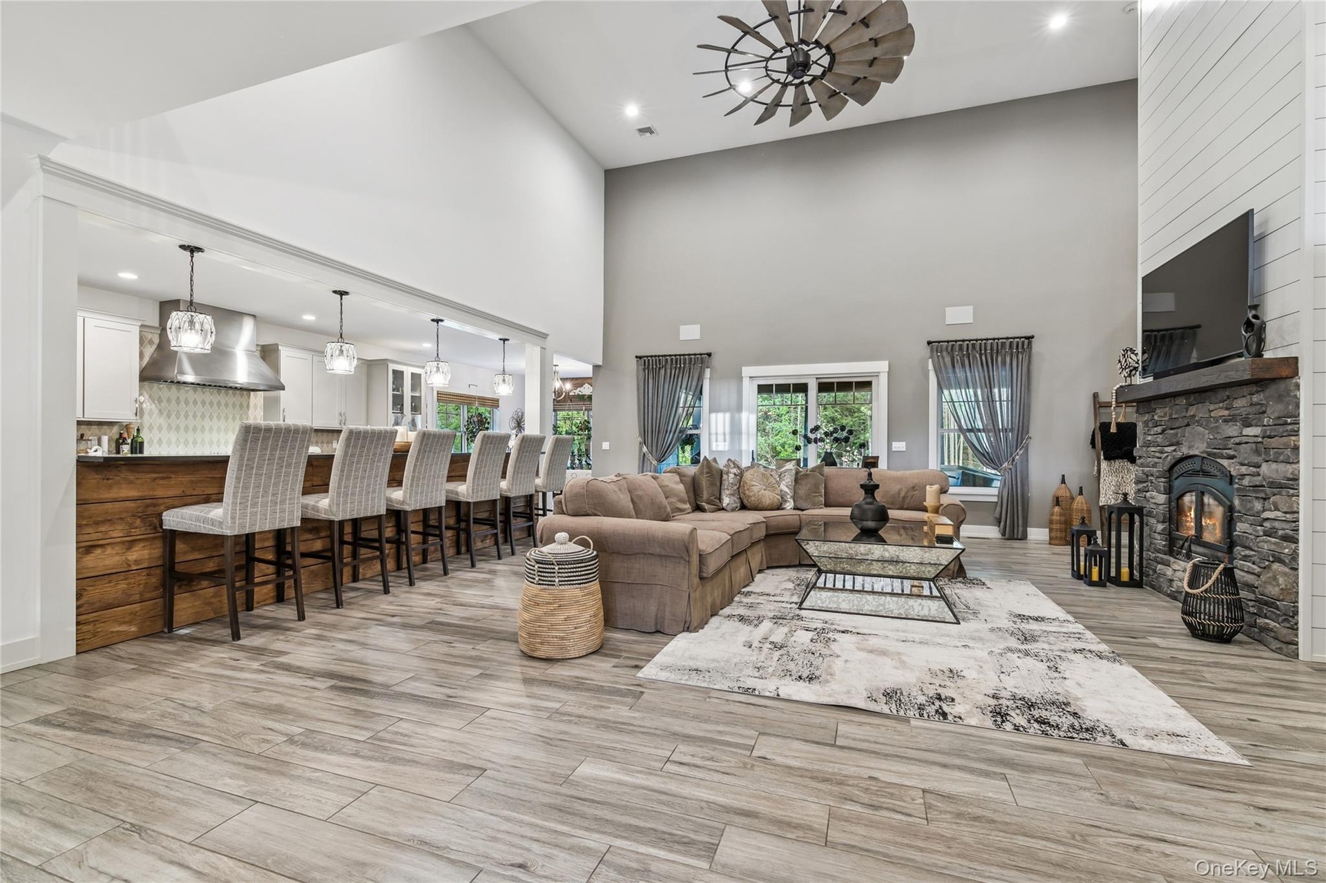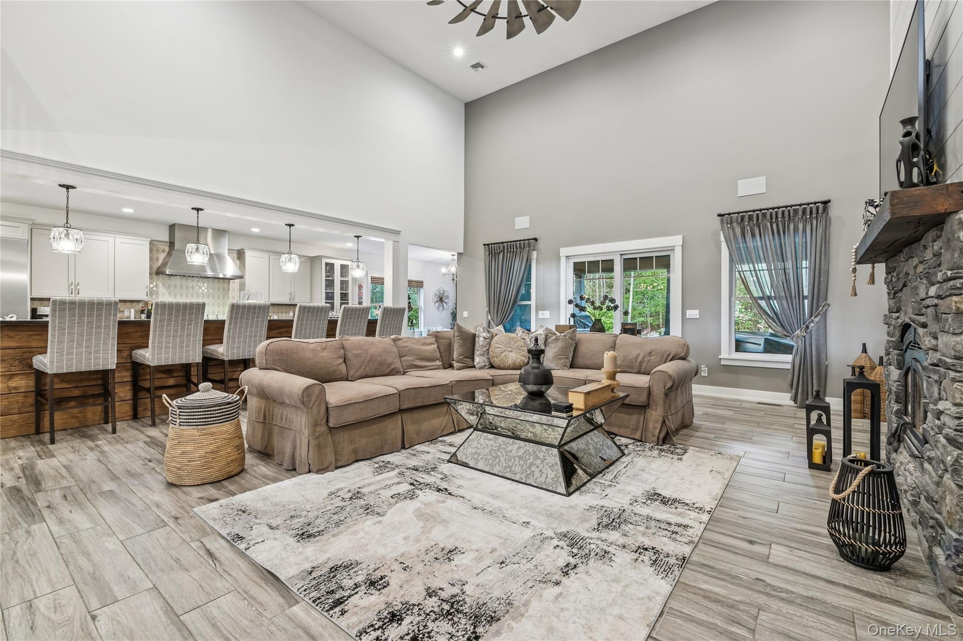 story living room, where natural light floods the open space and a shiplap-accented fireplace wall soars up to 20 feet, creating a dramatic focal