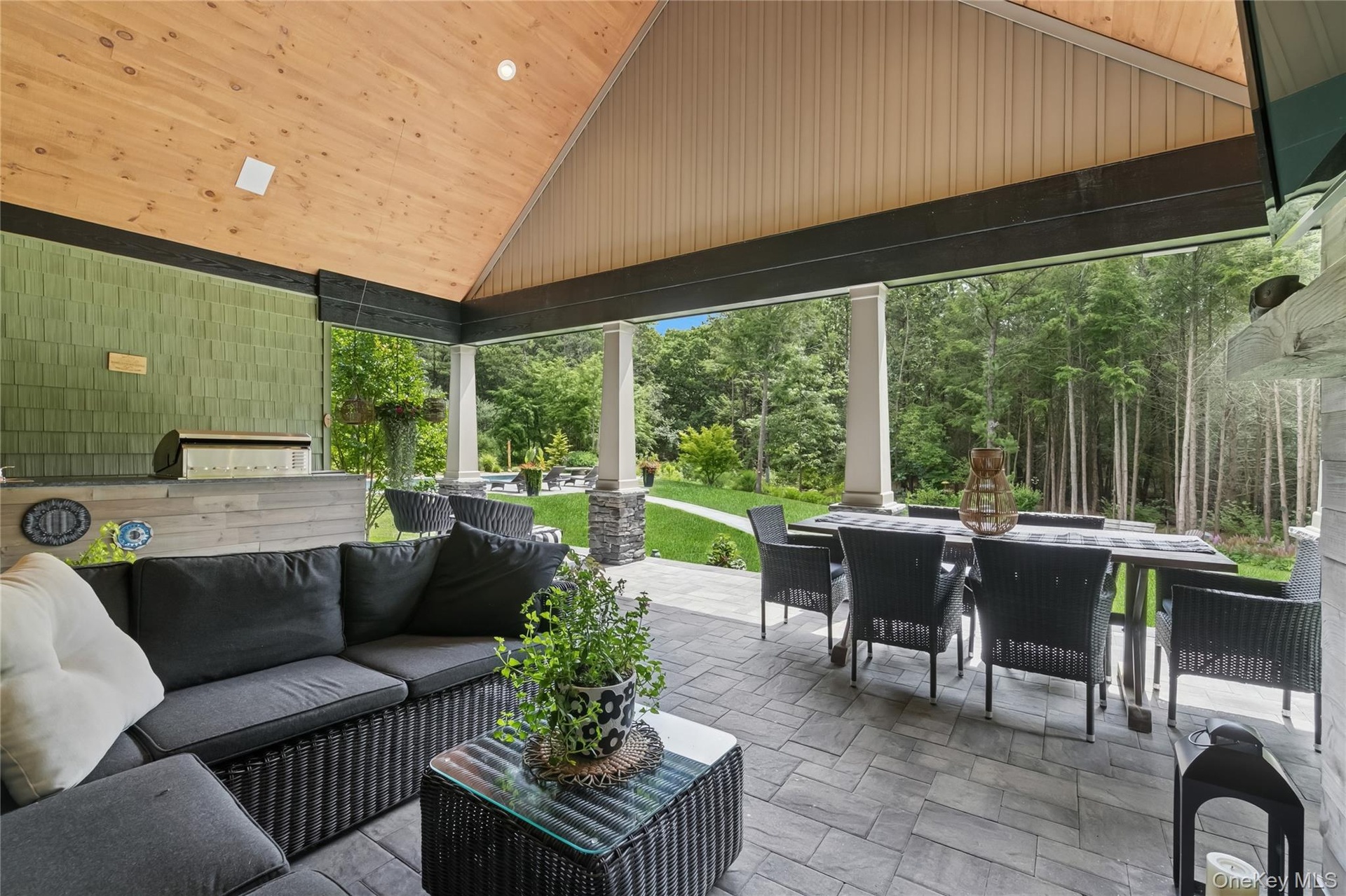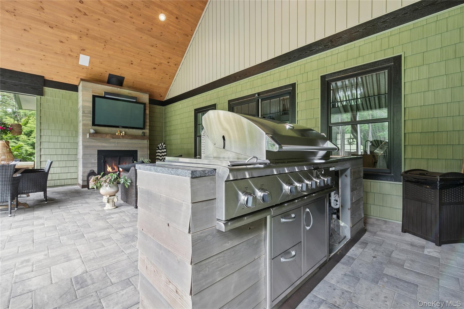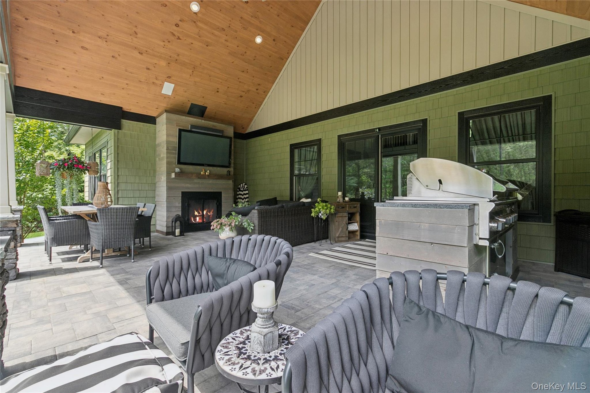 beyond, step into the stunning 18’ x 28’ covered lanai, fully outfitted with an outdoor kitchen, built-in bar, BBQ, and wood-burning fireplace. This