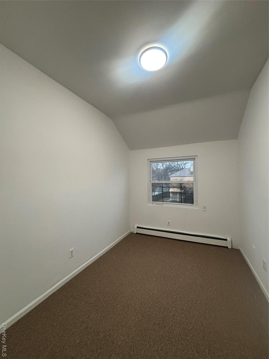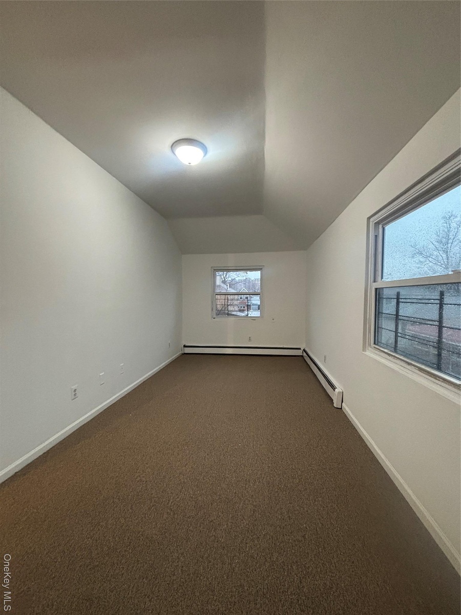 - Additional living space featuring vaulted ceiling, carpet floors, and baseboard heating