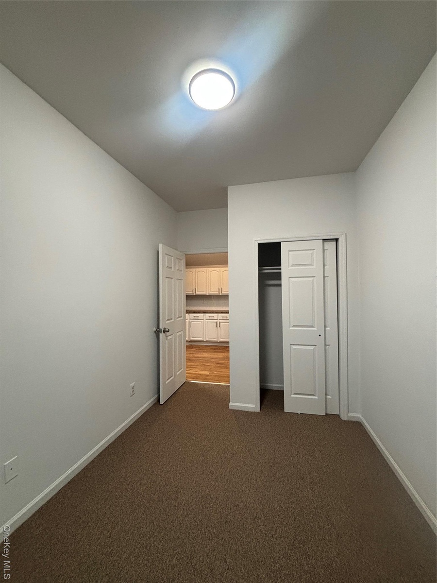 - Unfurnished bedroom featuring dark colored carpet and a closet