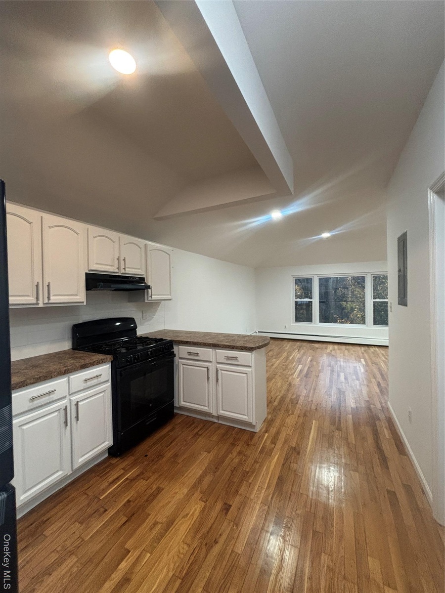 - Kitchen featuring white cabinetry, range, a peninsula, dark wood-type flooring, and a baseboard heating unit