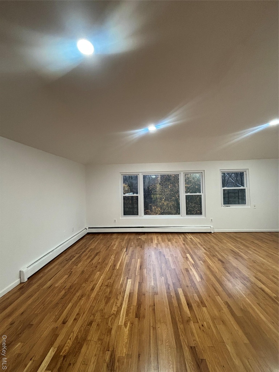 - Unfurnished room featuring baseboard heating and hardwood / wood-style flooring